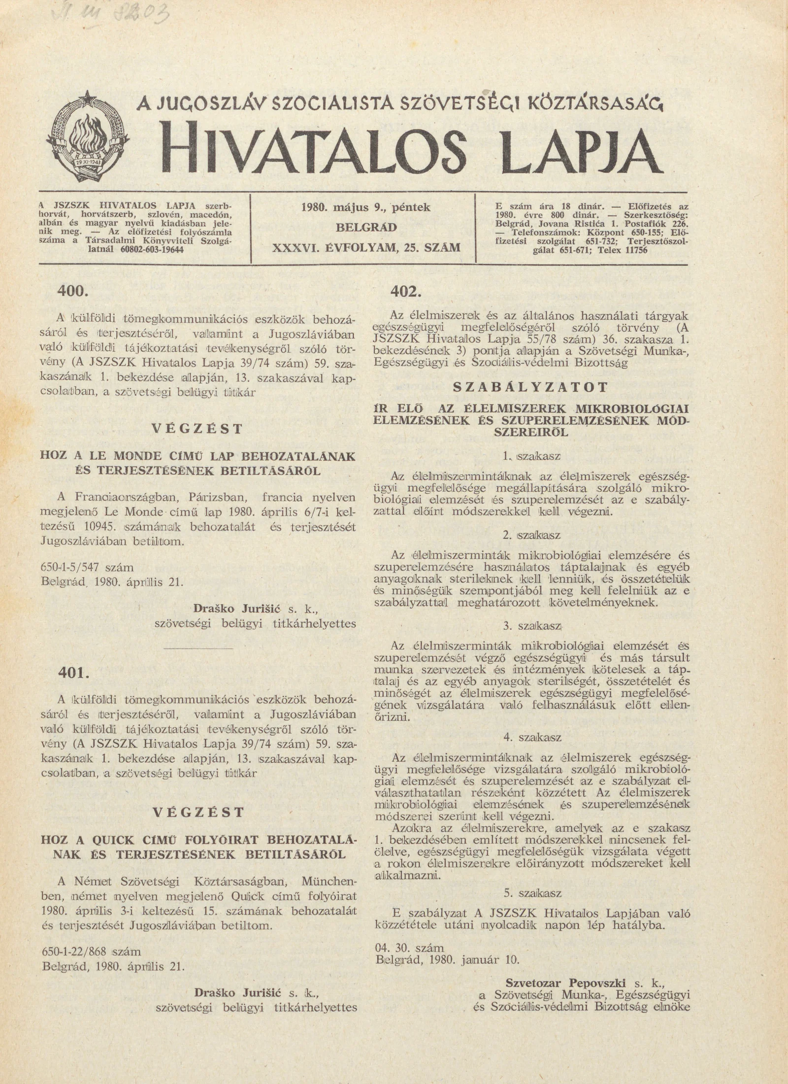 - Végzés a Quick című folyóirat behozatalának és terjesztésének betiltásáról853