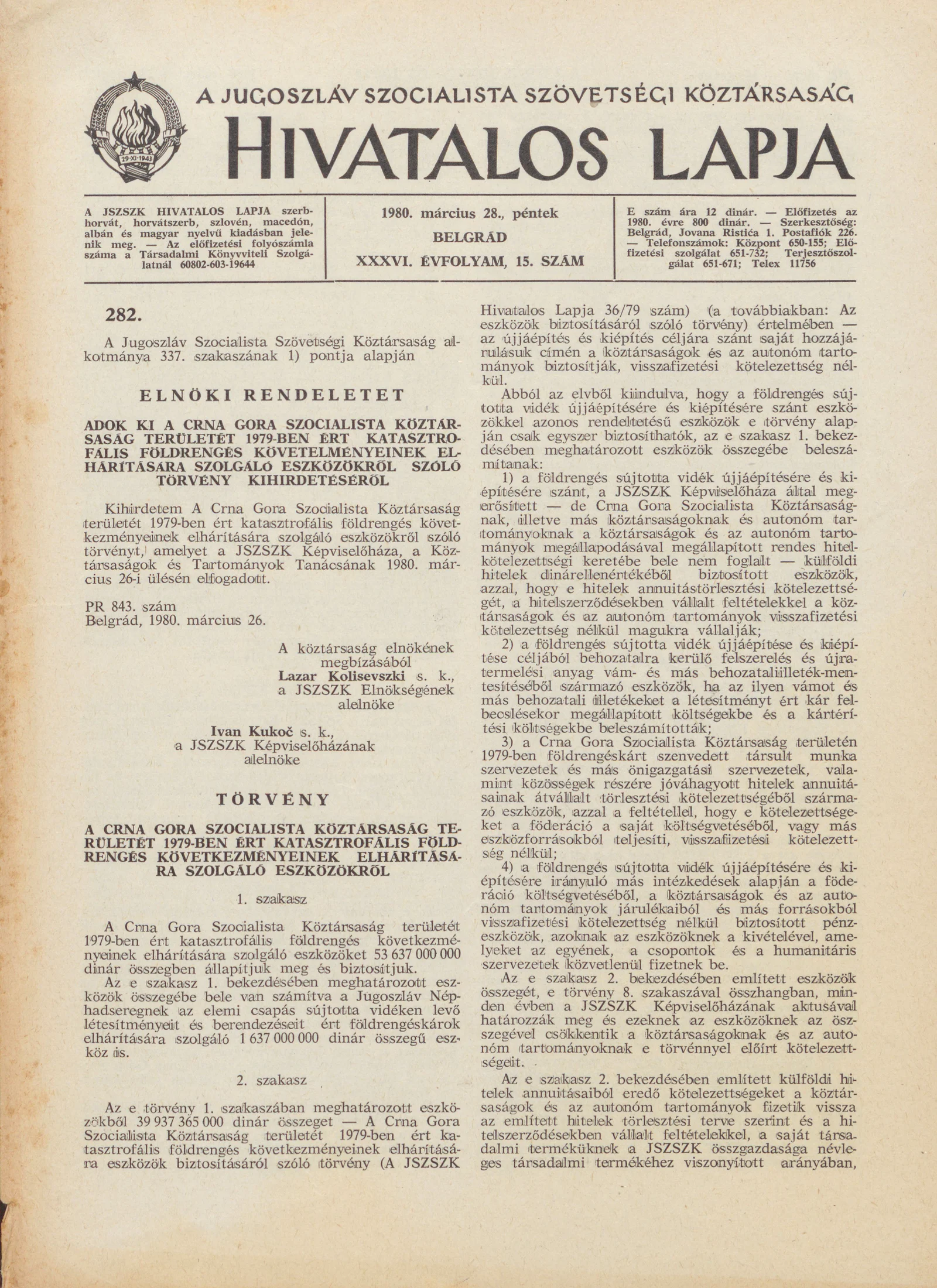 - Törvény a Crna Gora Szocialista Köztársság területét 1979-ben ért katasztrofális földrengés következményeinek elhárítására szolgáló eszközökről477