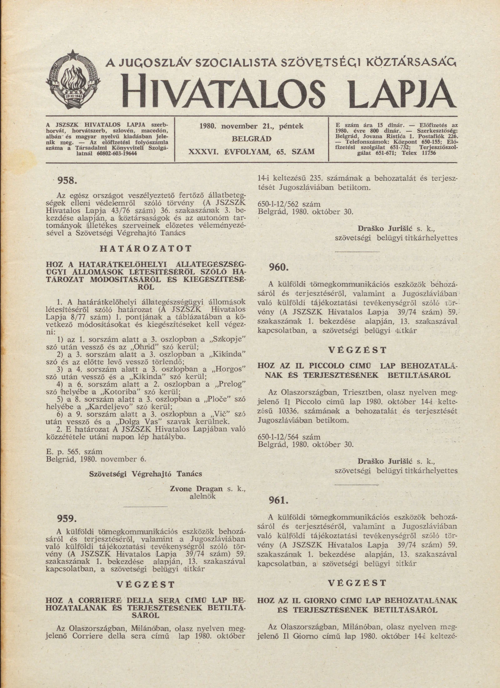A Jugoszláv Szocialista Szövetségi Köztársaság Hivatalos Lapja, 36. évf. 1980. november 21. 65. sz. 1865–1904. oldal
