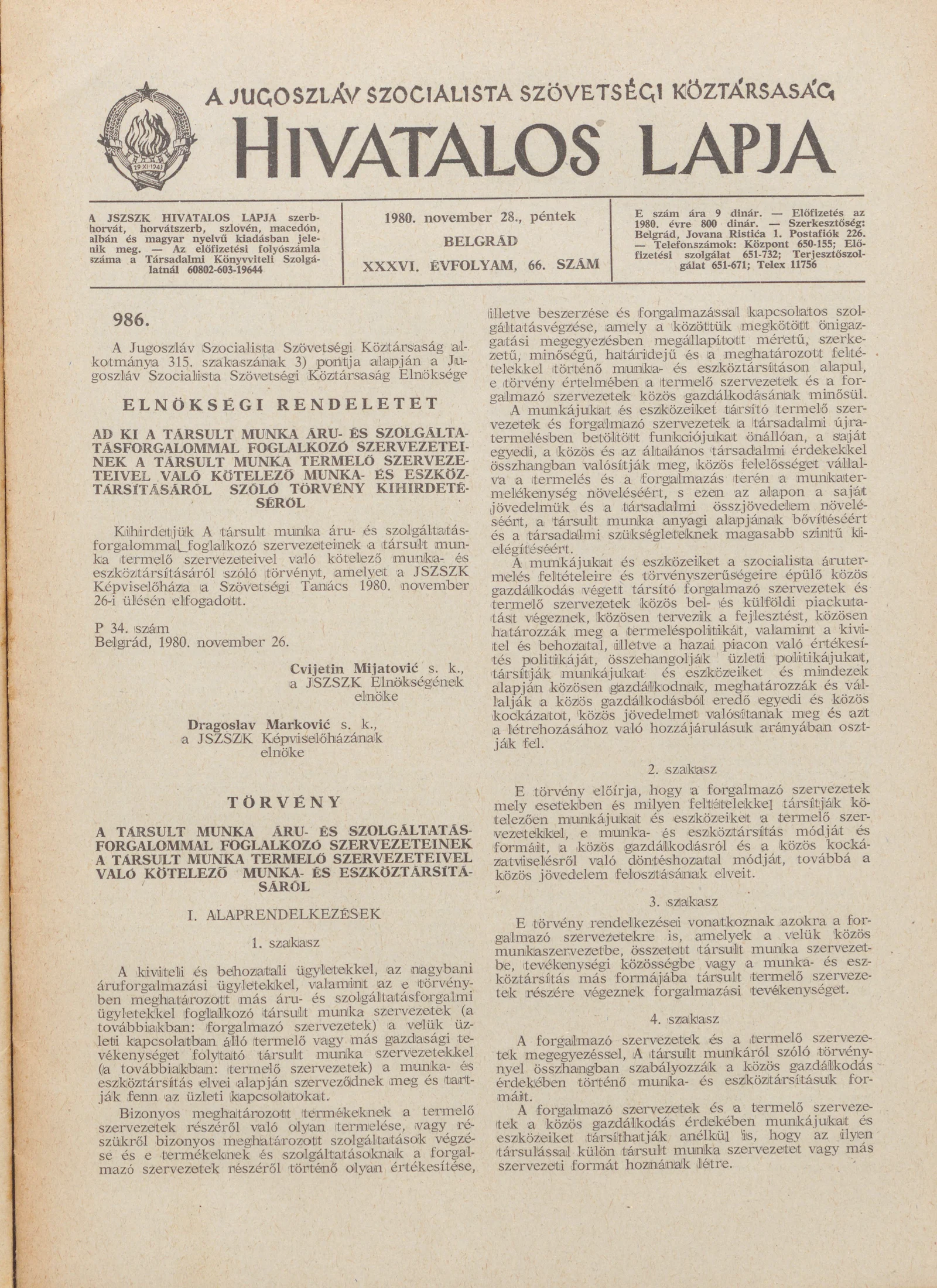 A Jugoszláv Szocialista Szövetségi Köztársaság Hivatalos Lapja, 36. évf. 1980. november 28. 66. sz. 1905–1928. oldal