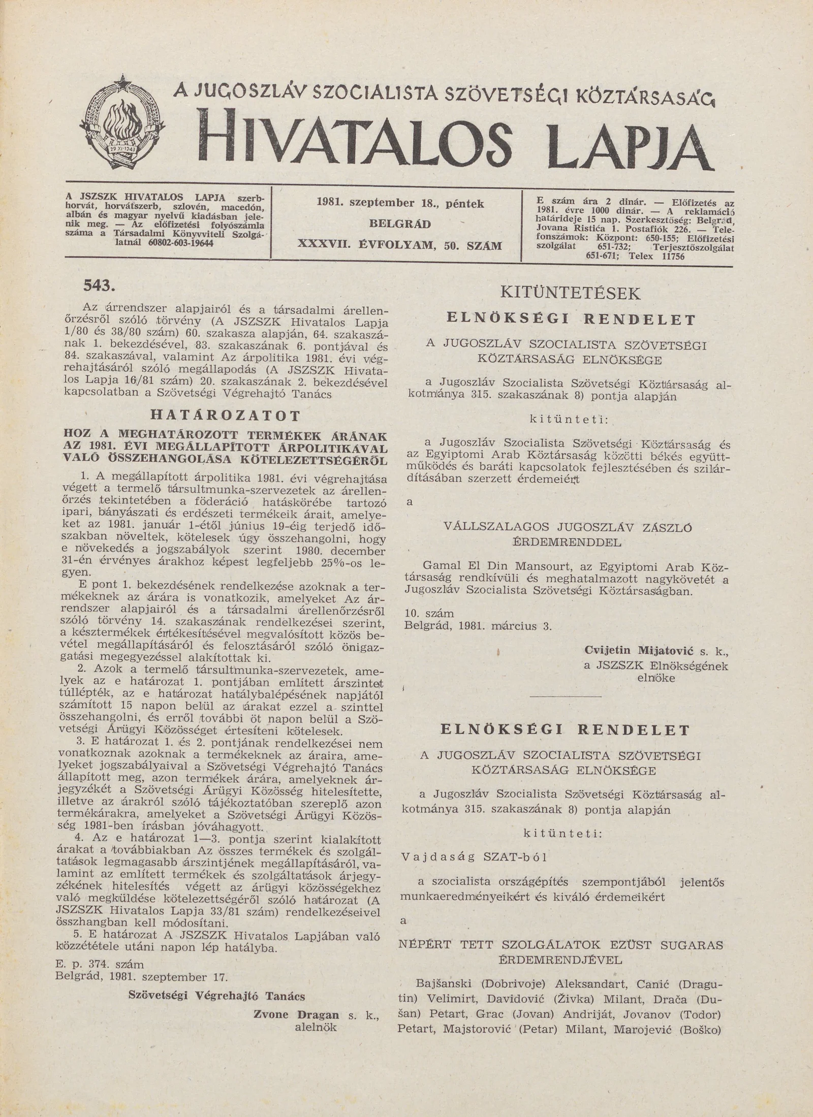 A Jugoszláv Szocialista Szövetségi Köztársaság Hivatalos Lapja, 37. évf. 1981. szeptember 18. 50. sz. 1285–1288. oldal