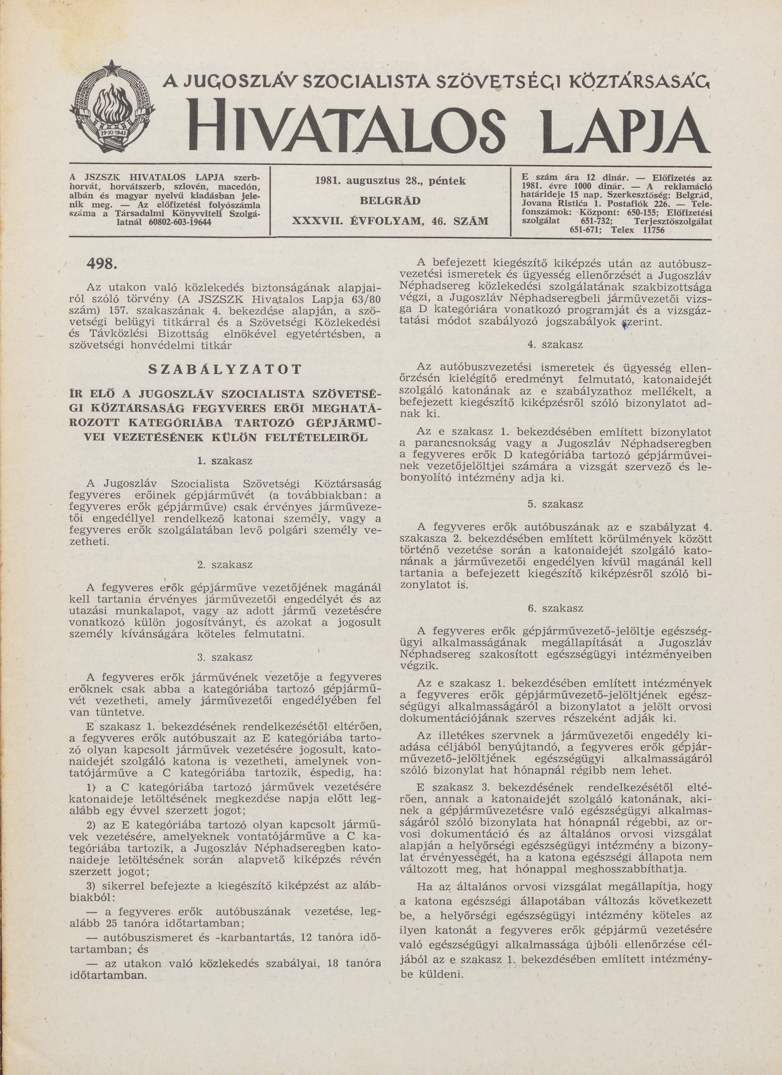 A Jugoszláv Szocialista Szövetségi Köztársaság Hivatalos Lapja, 37. évf. 1981. augusztus 28. 46. sz. 1189–1212. oldal