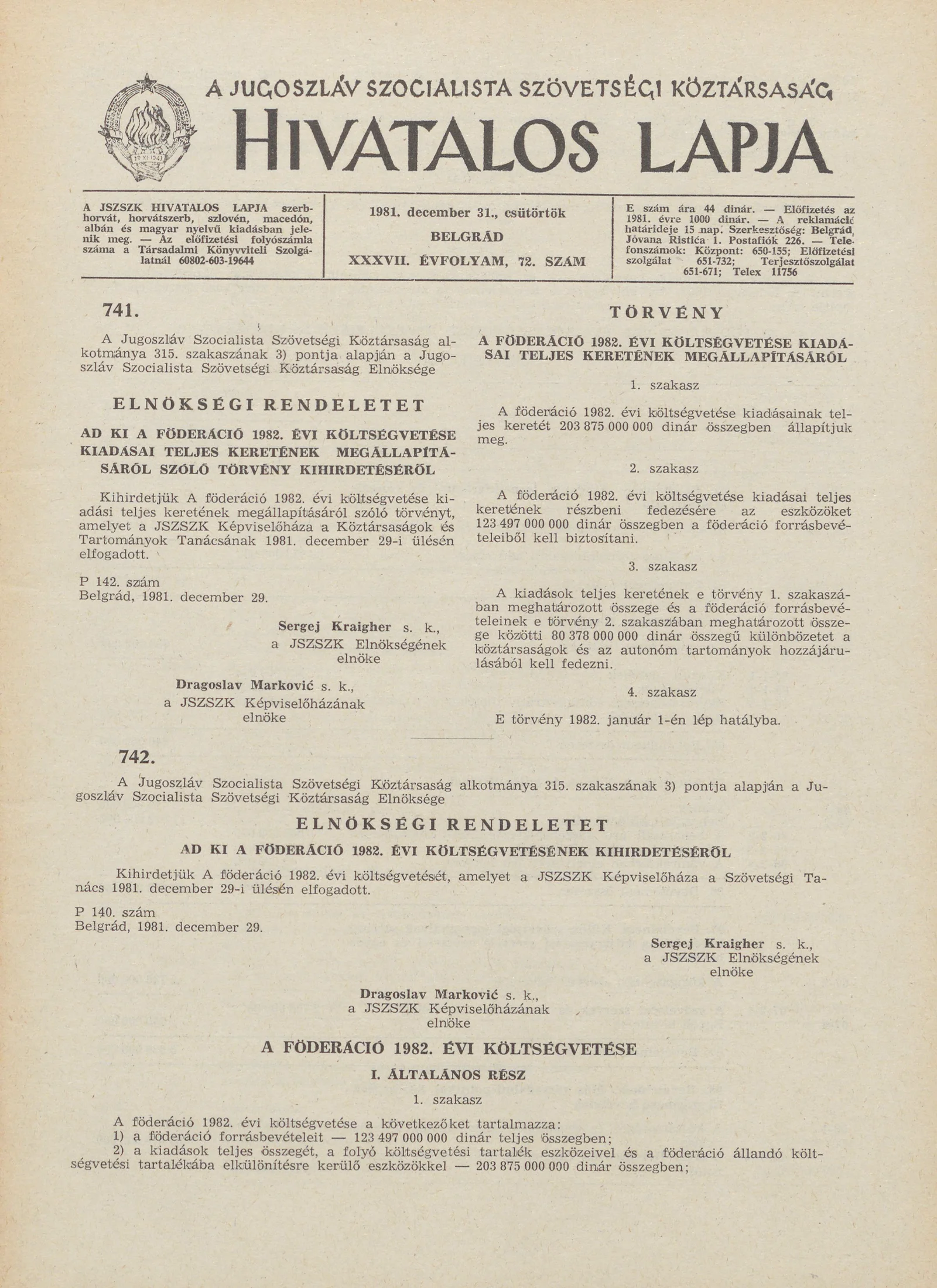 A Jugoszláv Szocialista Szövetségi Köztársaság Hivatalos Lapja, 37. évf. 1981. december 31. 72. sz. 1829–1916. oldal