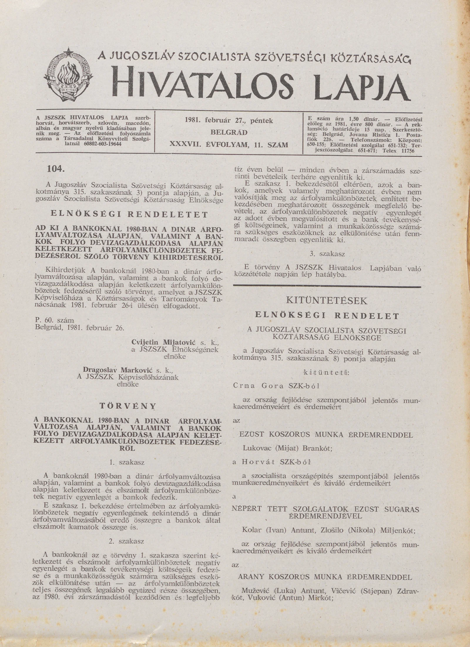 A Jugoszláv Szocialista Szövetségi Köztársaság Hivatalos Lapja, 37. évf. 1981. február 27. 11. sz. 301–304. oldal