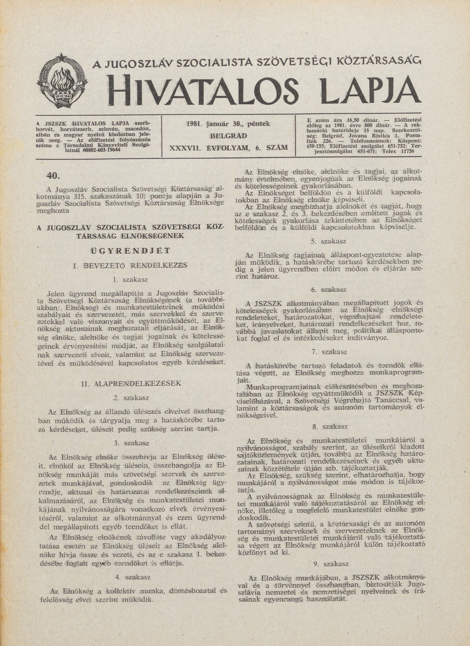 - Ügyrendje a Jugoszláv Szocialista Szövetségi Köztársaság Elnökségének 189