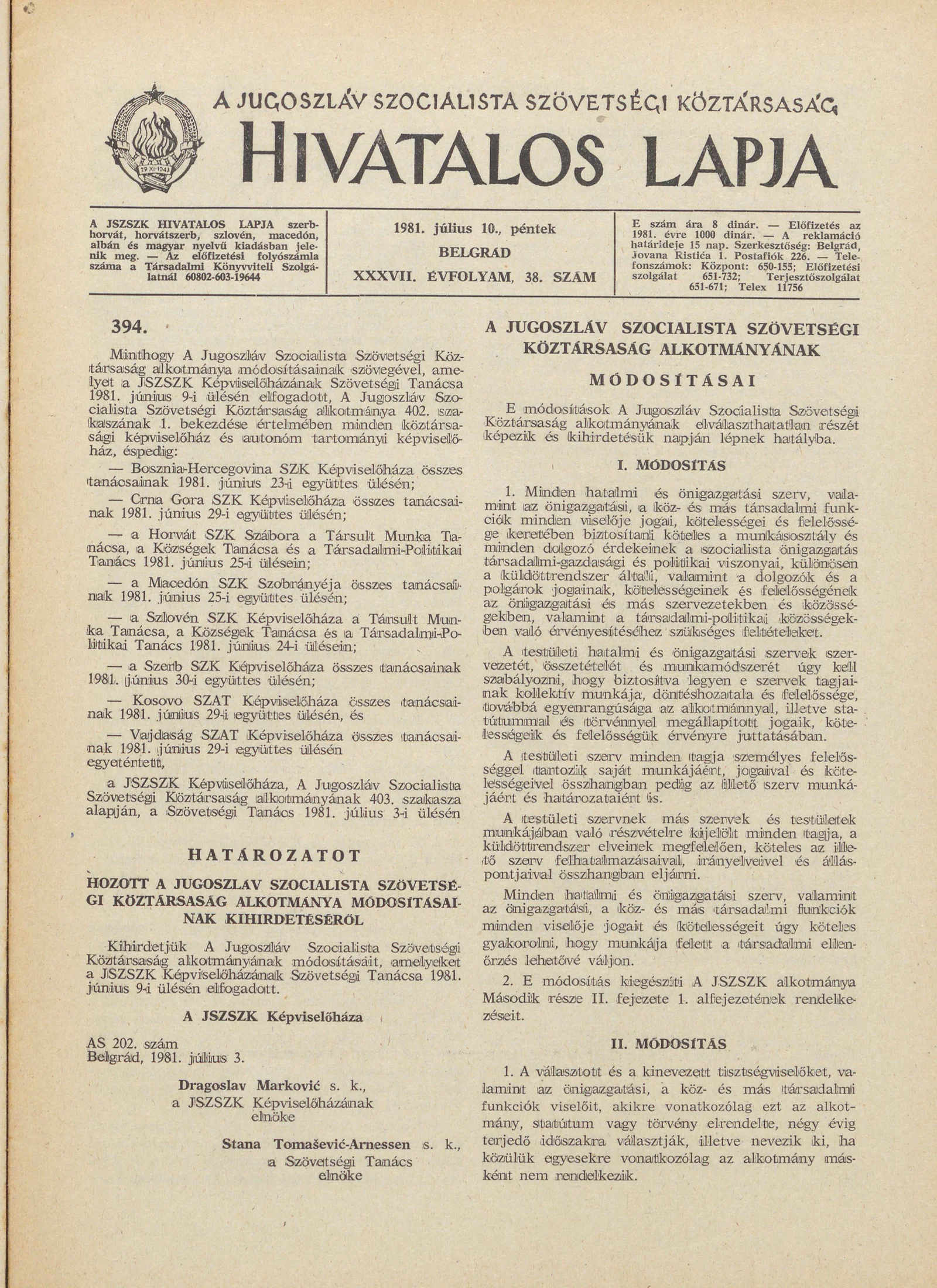 A Jugoszláv Szocialista Szövetségi Köztársaság Hivatalos Lapja, 37. évf. 1981. július 10. 38. sz. 981–996. oldal