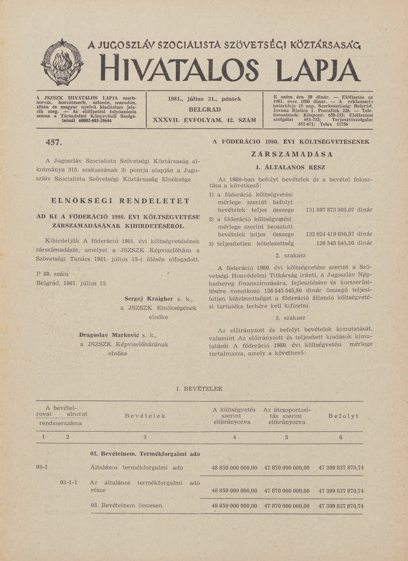 A Jugoszláv Szocialista Szövetségi Köztársaság Hivatalos Lapja, 37. évf. 1981. július 31. 42. sz. 1061–1120. oldal