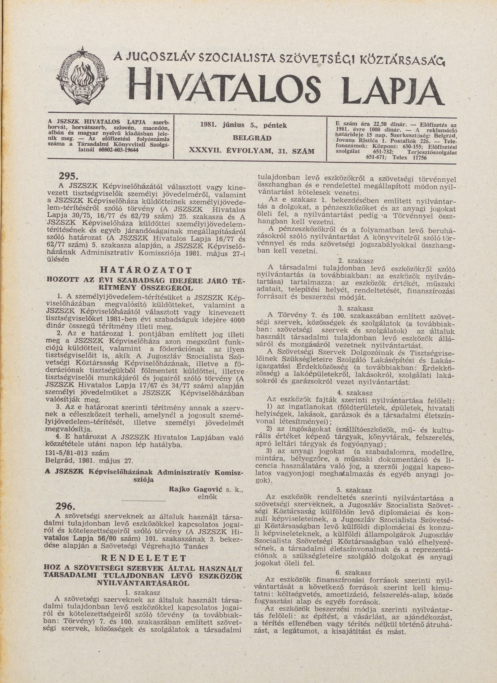 - Határozat A JSZSZK Hivatalos Lapja című kiadvány 1981. évi előfizetési díjáról836