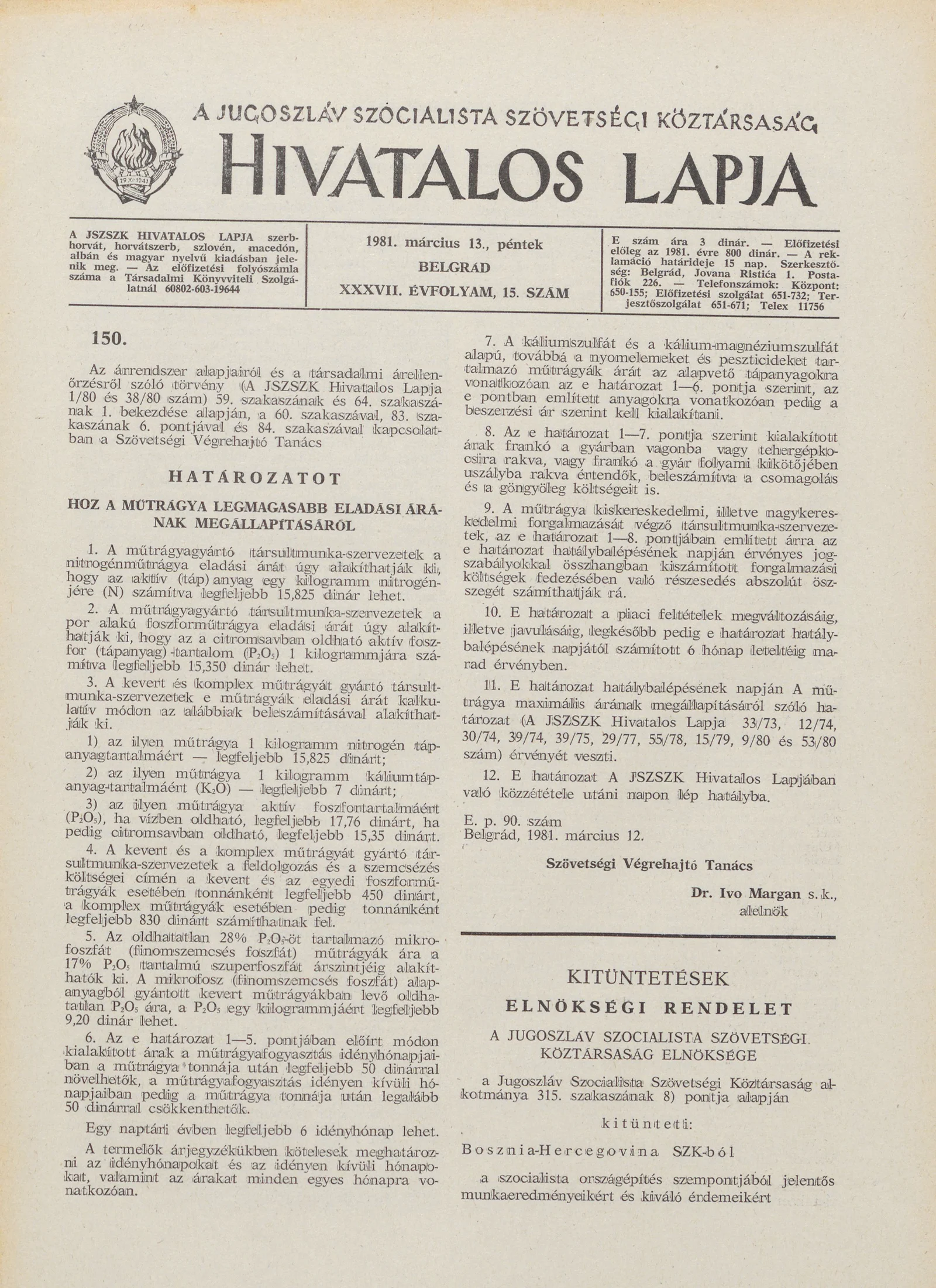 A Jugoszláv Szocialista Szövetségi Köztársaság Hivatalos Lapja, 37. évf. 1981. március 13. 15. sz. 389–396. oldal