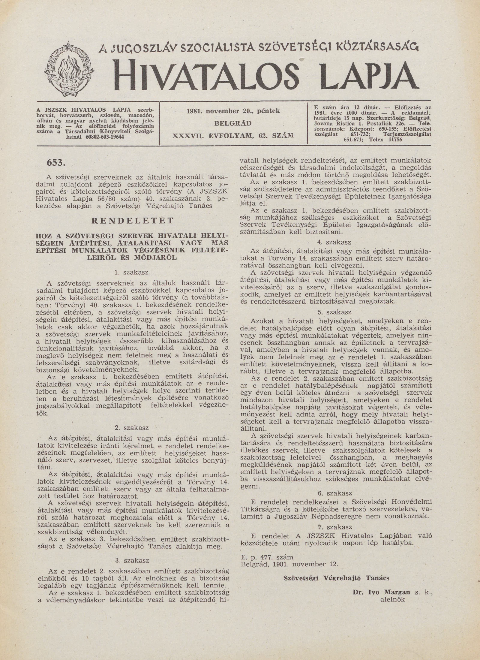 A Jugoszláv Szocialista Szövetségi Köztársaság Hivatalos Lapja, 37. évf. 1981. november 20. 62. sz. 1581–1604. oldal