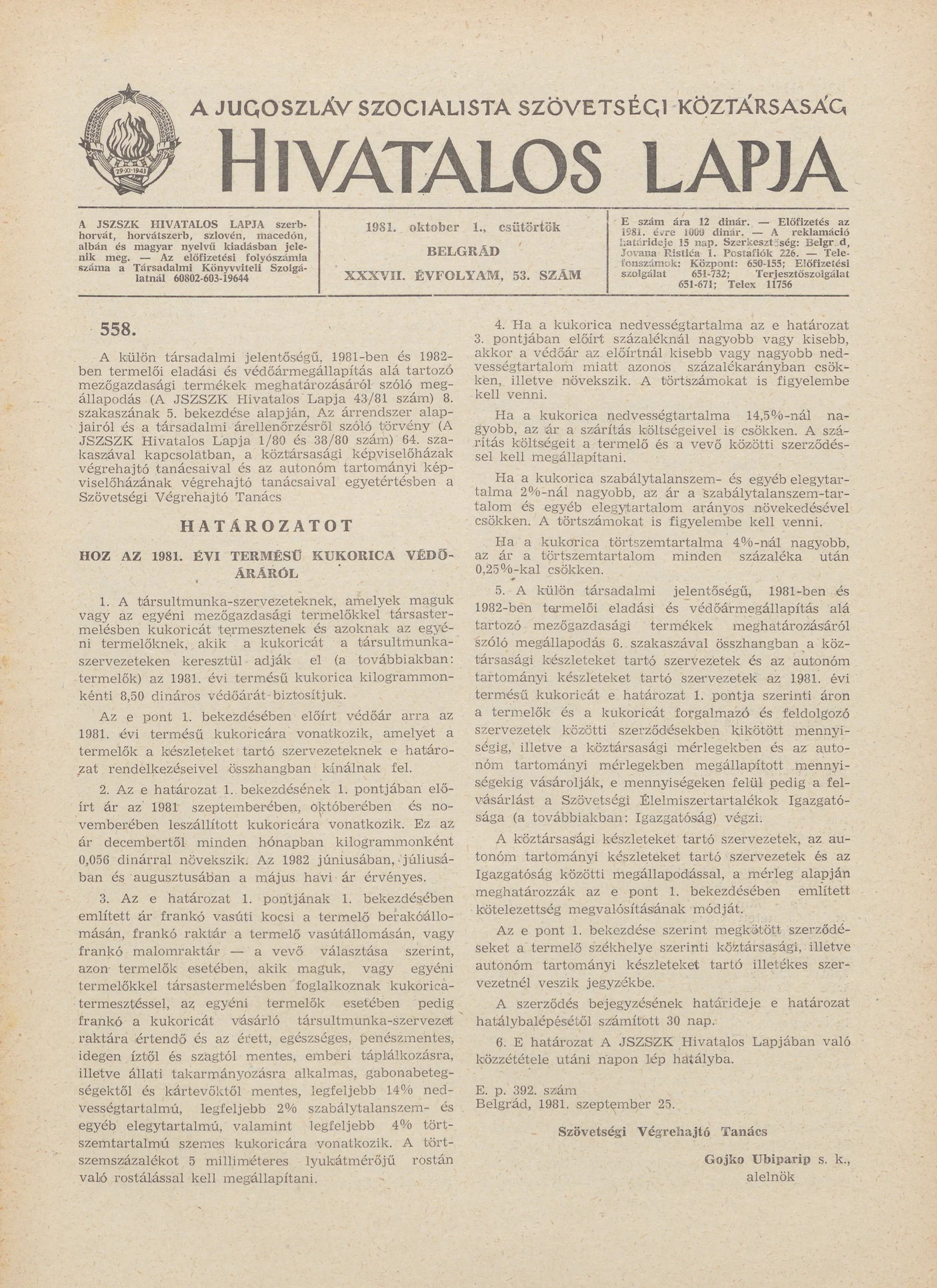 - Határozat az 1981. évi termésű kukorica védőáráról 1441