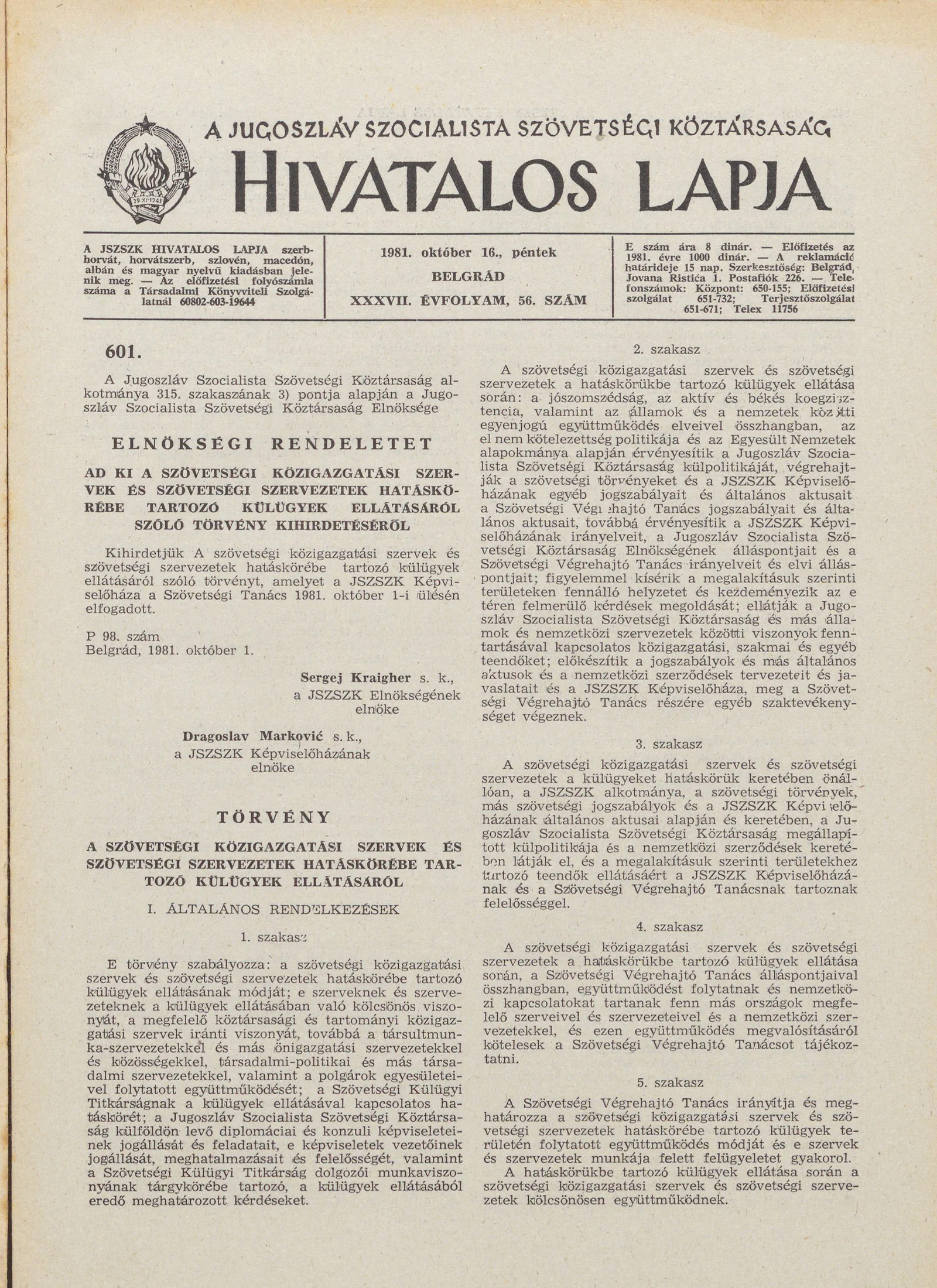 A Jugoszláv Szocialista Szövetségi Köztársaság Hivatalos Lapja, 37. évf. 1981. október 16. 56. sz. 1477–1492. oldal