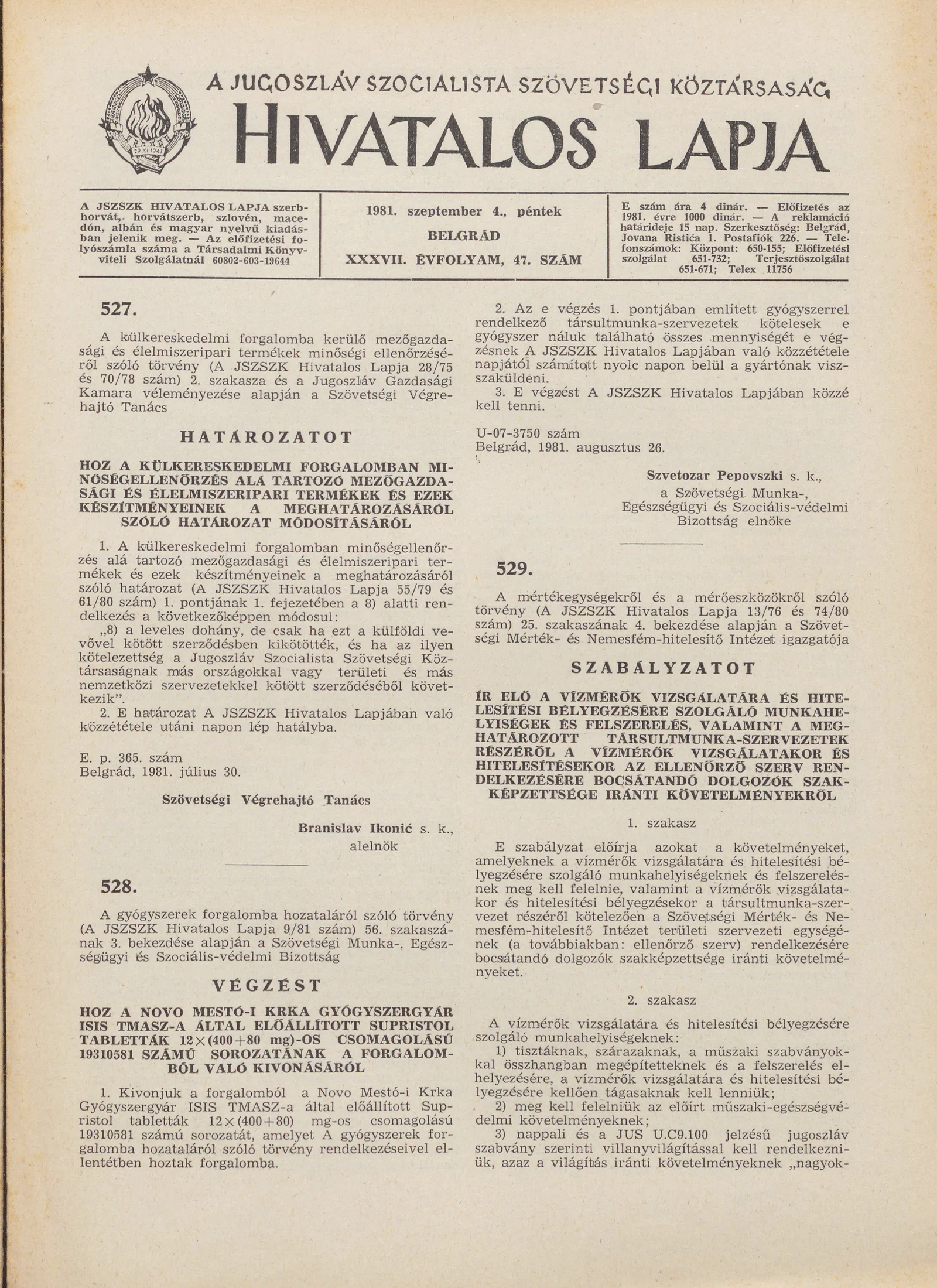 A Jugoszláv Szocialista Szövetségi Köztársaság Hivatalos Lapja, 37. évf. 1981. szeptember 4. 47. sz. 1213–1220. oldal