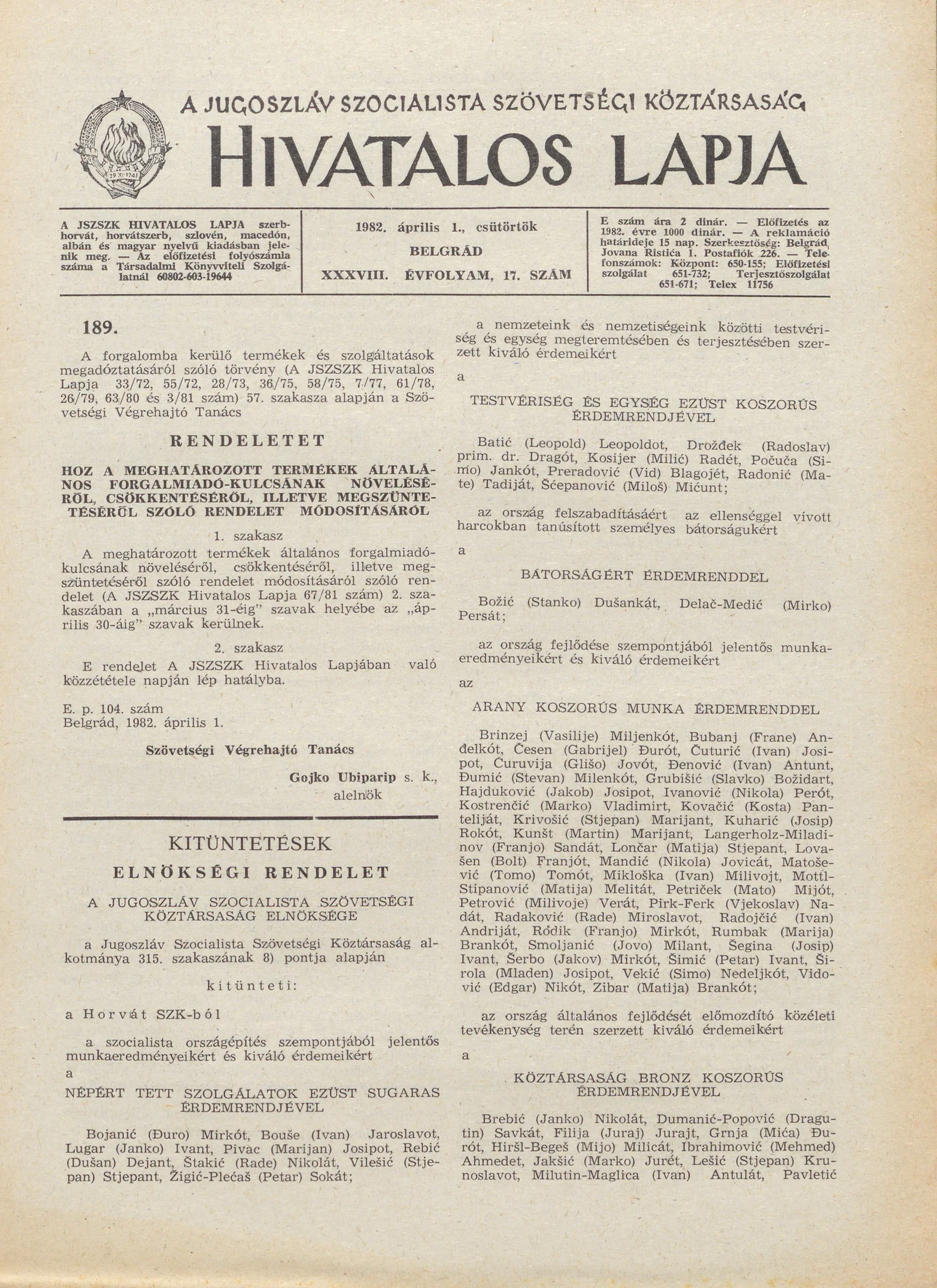 A Jugoszláv Szocialista Szövetségi Köztársaság Hivatalos Lapja, 38. évf. 1982. április 1. 17. sz. 465–468. oldal