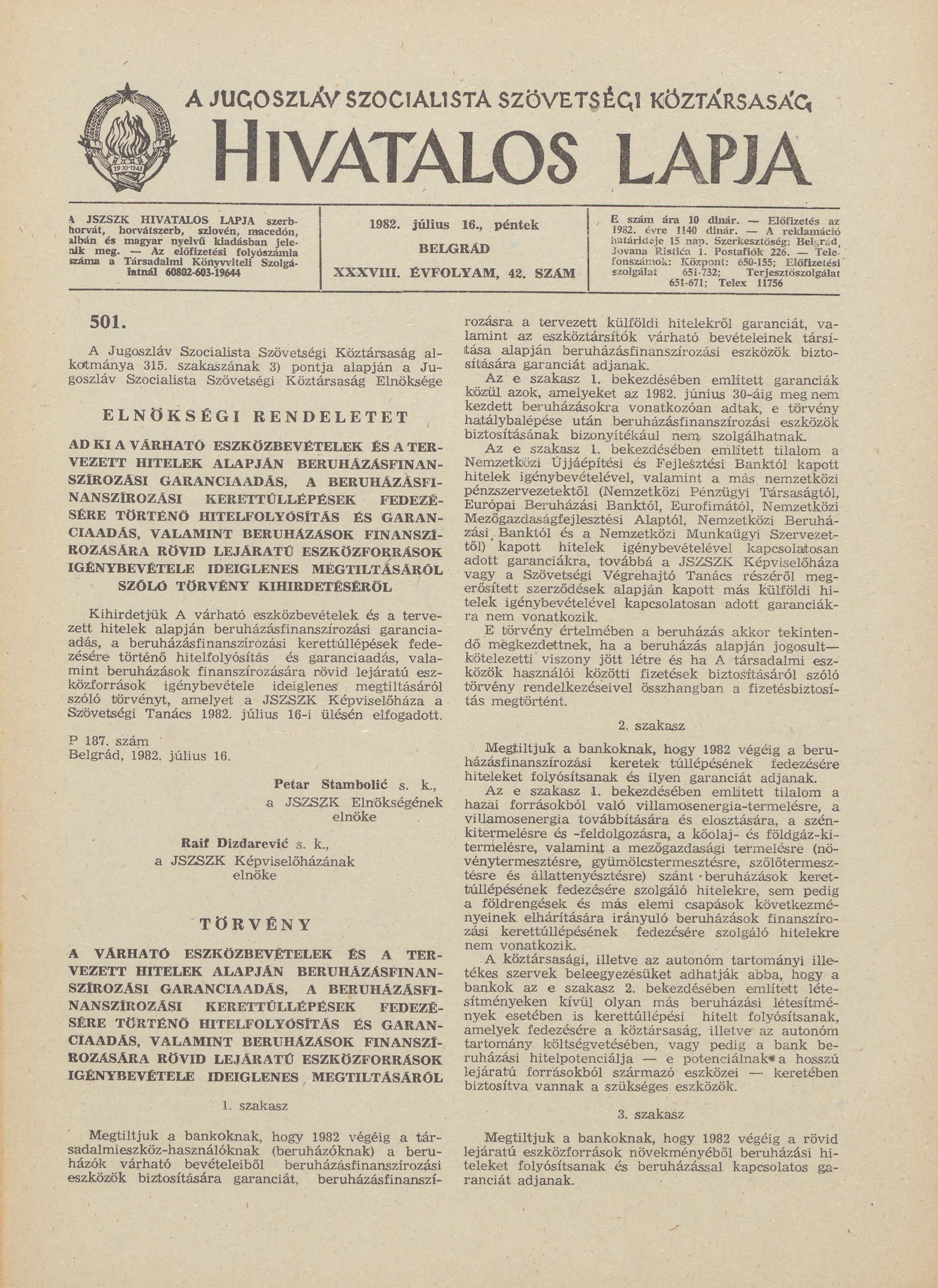 A Jugoszláv Szocialista Szövetségi Köztársaság Hivatalos Lapja, 38. évf. 1982. július 16. 42. sz. 1049–1064. oldal