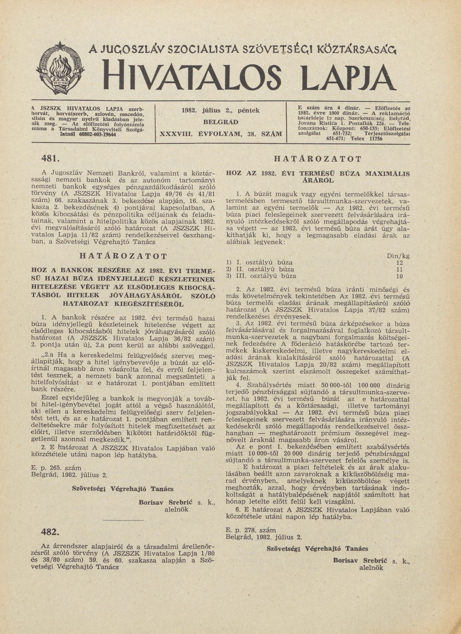 A Jugoszláv Szocialista Szövetségi Köztársaság Hivatalos Lapja, 38. évf. 1982. július 2. 38. sz. 1025–1032. oldal