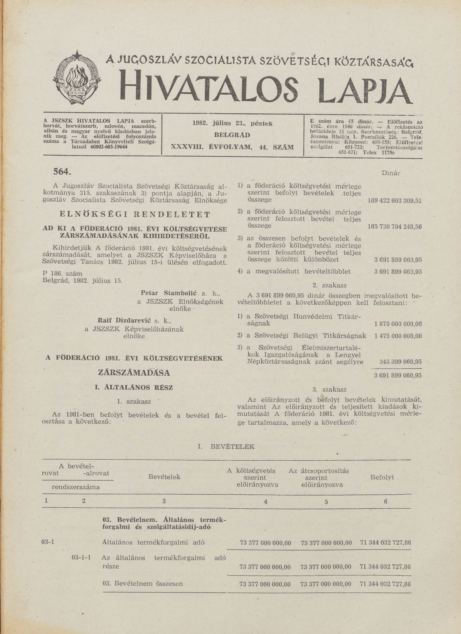 A Jugoszláv Szocialista Szövetségi Köztársaság Hivatalos Lapja, 38. évf. 1982. július 23. 44. sz. 1113–1184. oldal
