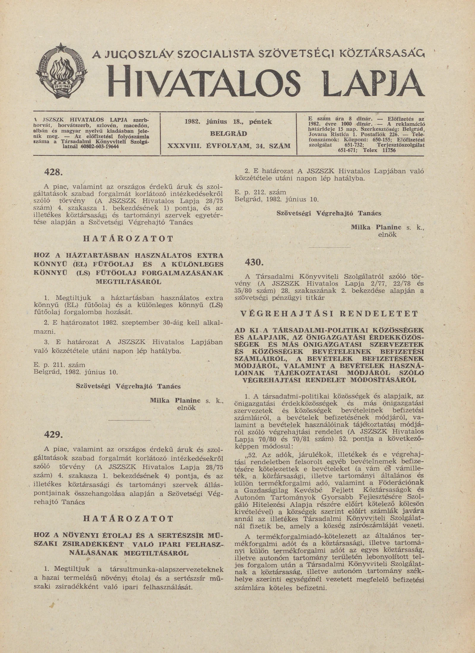 A Jugoszláv Szocialista Szövetségi Köztársaság Hivatalos Lapja, 38. évf. 1982. június 18. 34. sz. 953–968. oldal