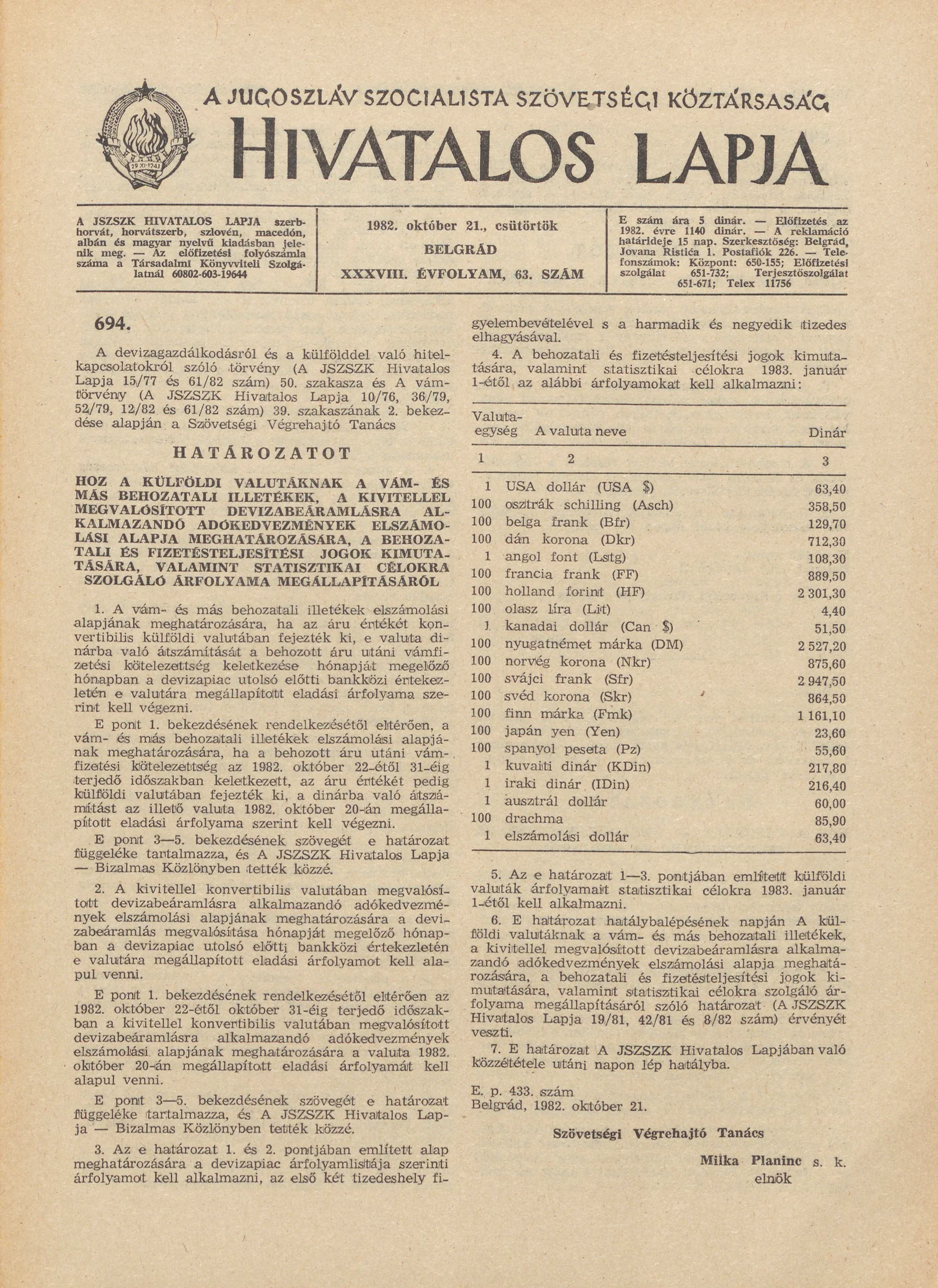 - A Jugoszláv Szocialista Szövetségi Köztársaság Hivatalos Lapja