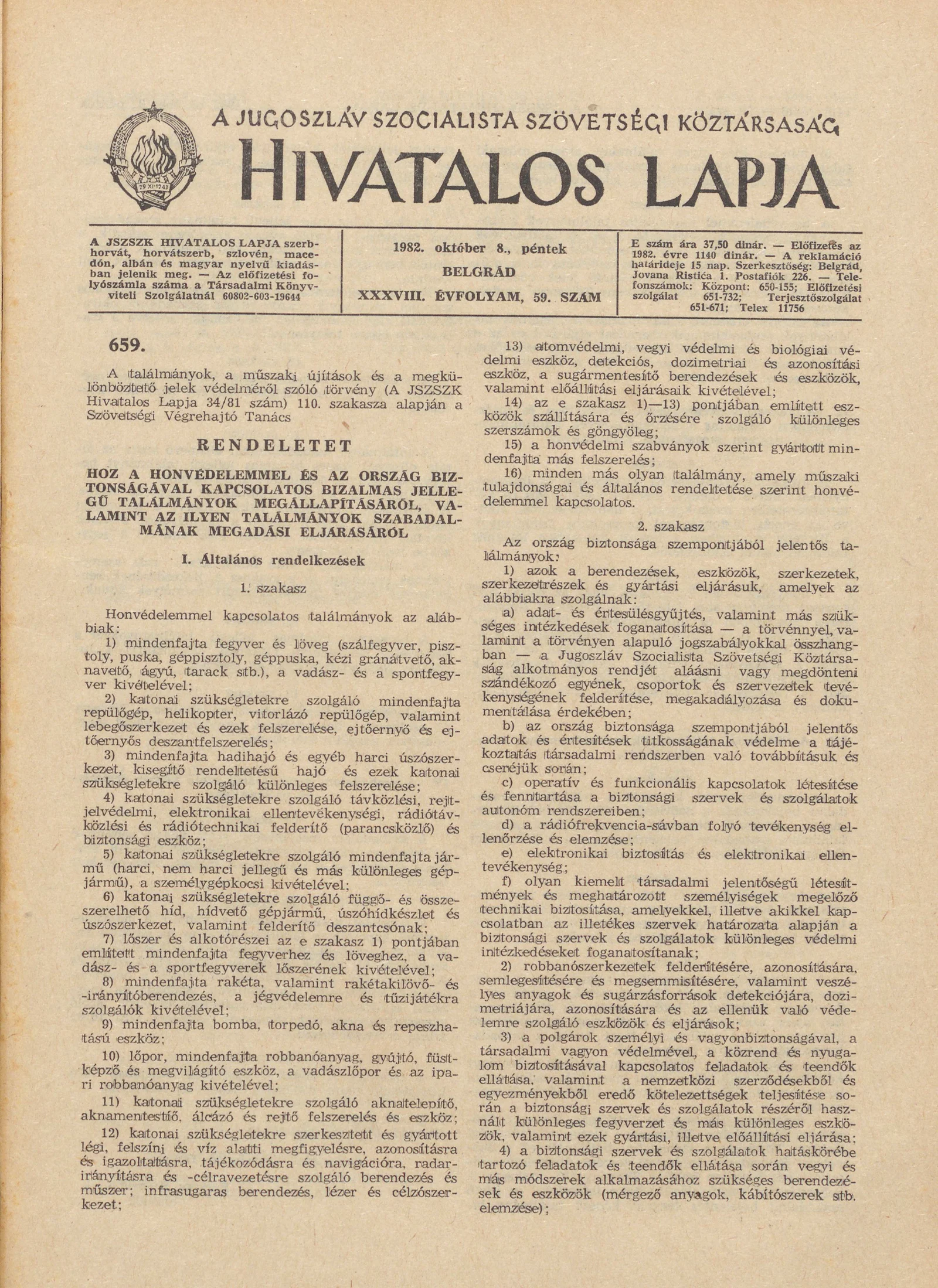 A Jugoszláv Szocialista Szövetségi Köztársaság Hivatalos Lapja, 38. évf. 1982. október 8. 59. sz. 1417–1476. oldal