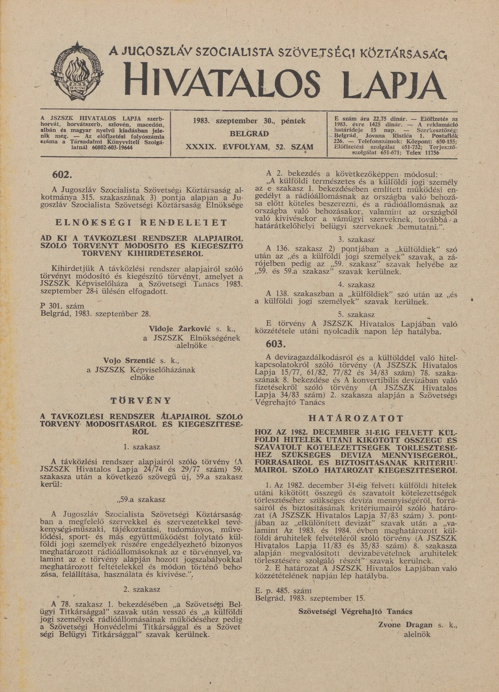 A Jugoszláv Szocialista Szövetségi Köztársaság Hivatalos Lapja, 39. évf. 1983. szeptember 30. 52. sz. 1449–1476. oldal