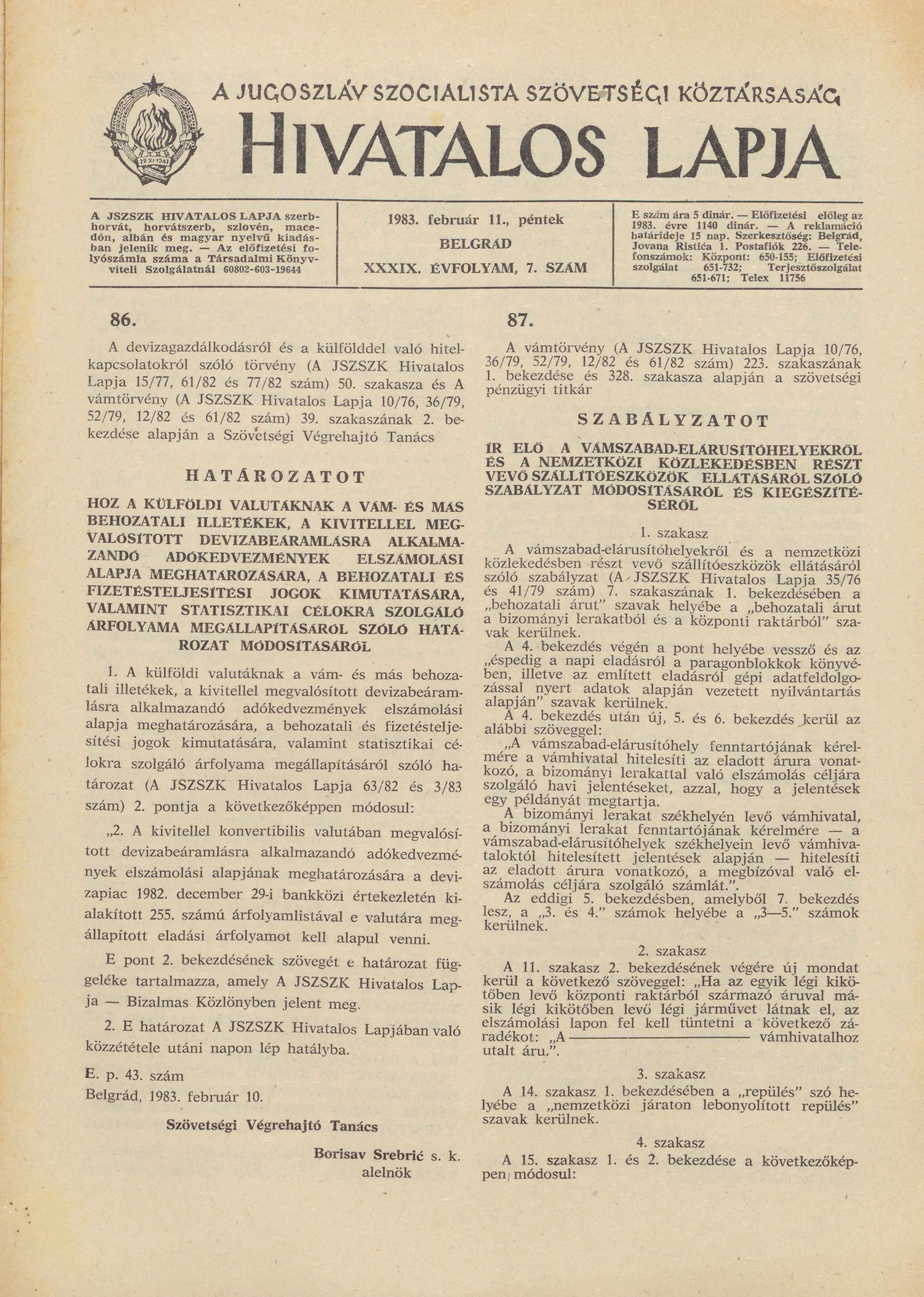 A Jugoszláv Szocialista Szövetségi Köztársaság Hivatalos Lapja, 39. évf. 1983. február 11. 7. sz. 113–120. oldal