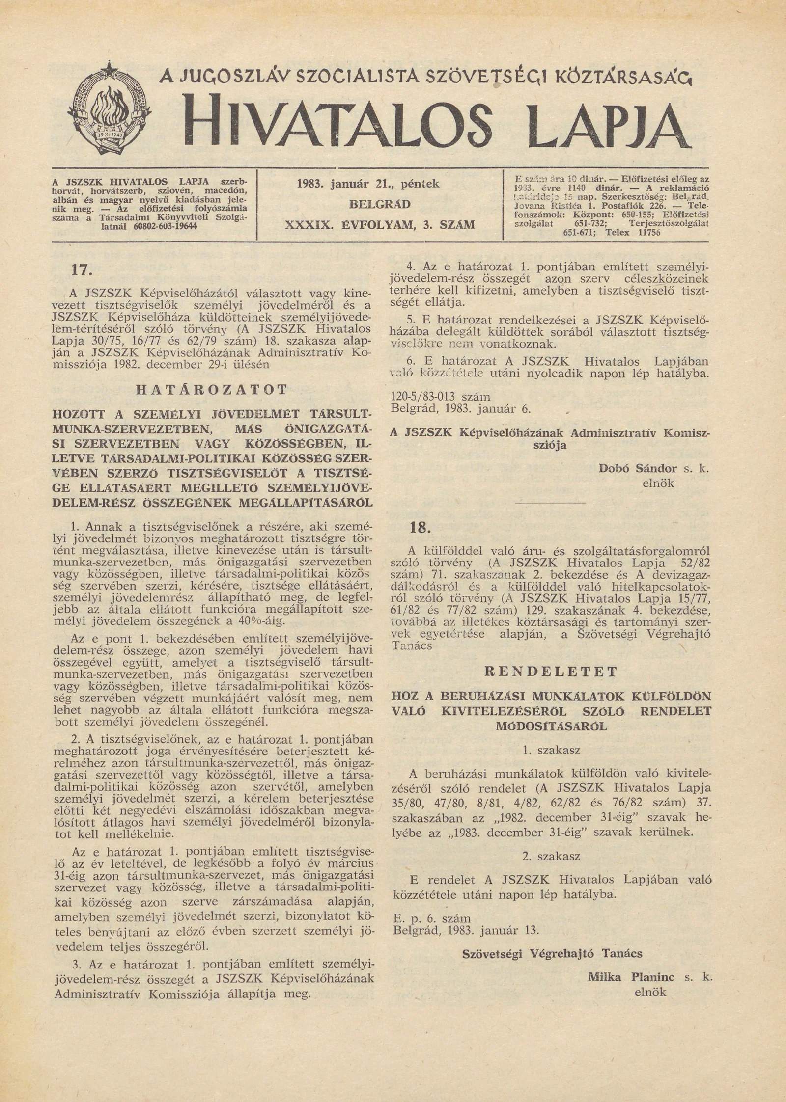 A Jugoszláv Szocialista Szövetségi Köztársaság Hivatalos Lapja, 39. évf. 1983. január 21. 3. sz. 29–44. oldal