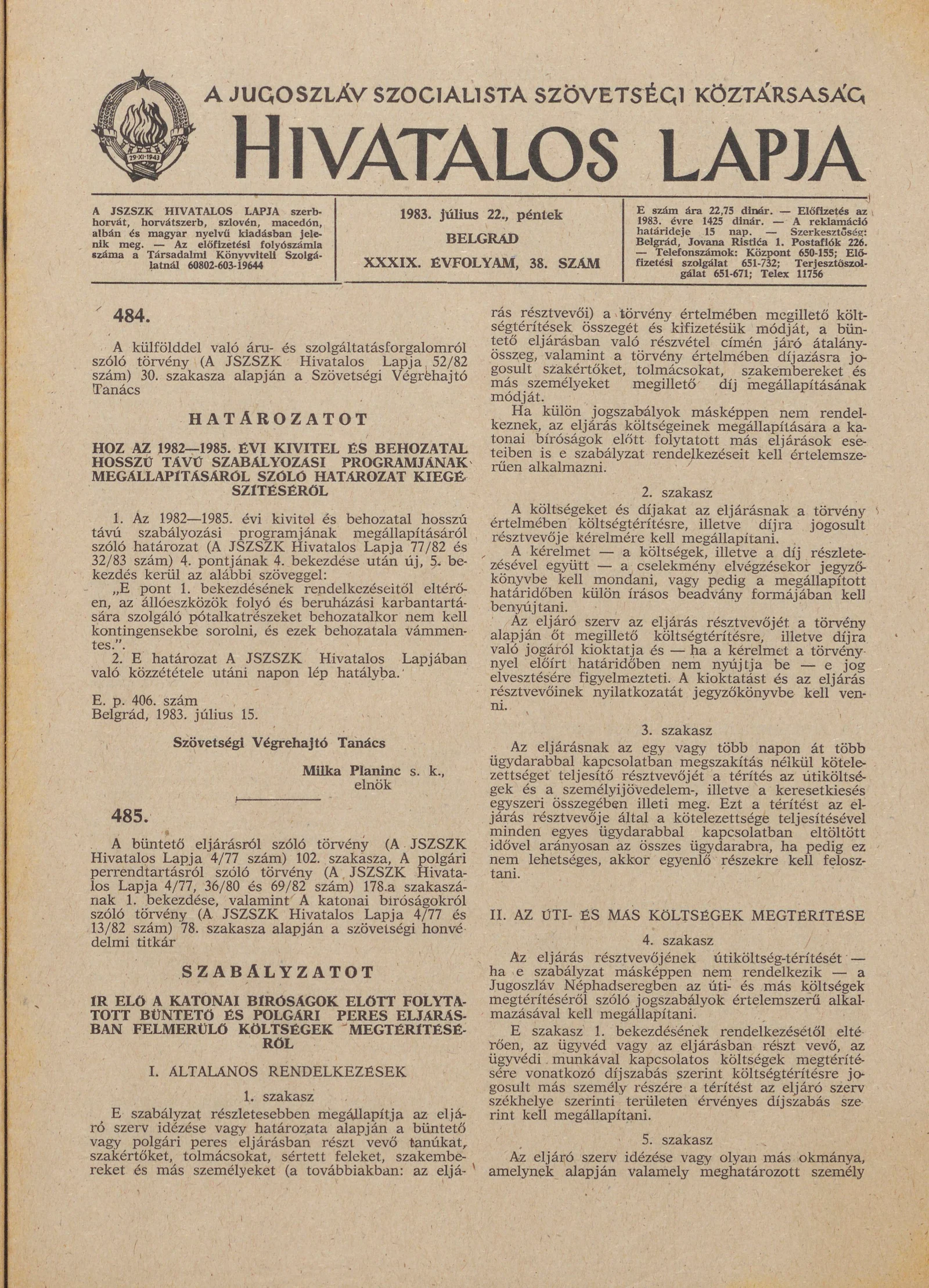 A Jugoszláv Szocialista Szövetségi Köztársaság Hivatalos Lapja, 39. évf. 1983. július 22. 38. sz. 1061–1088. oldal