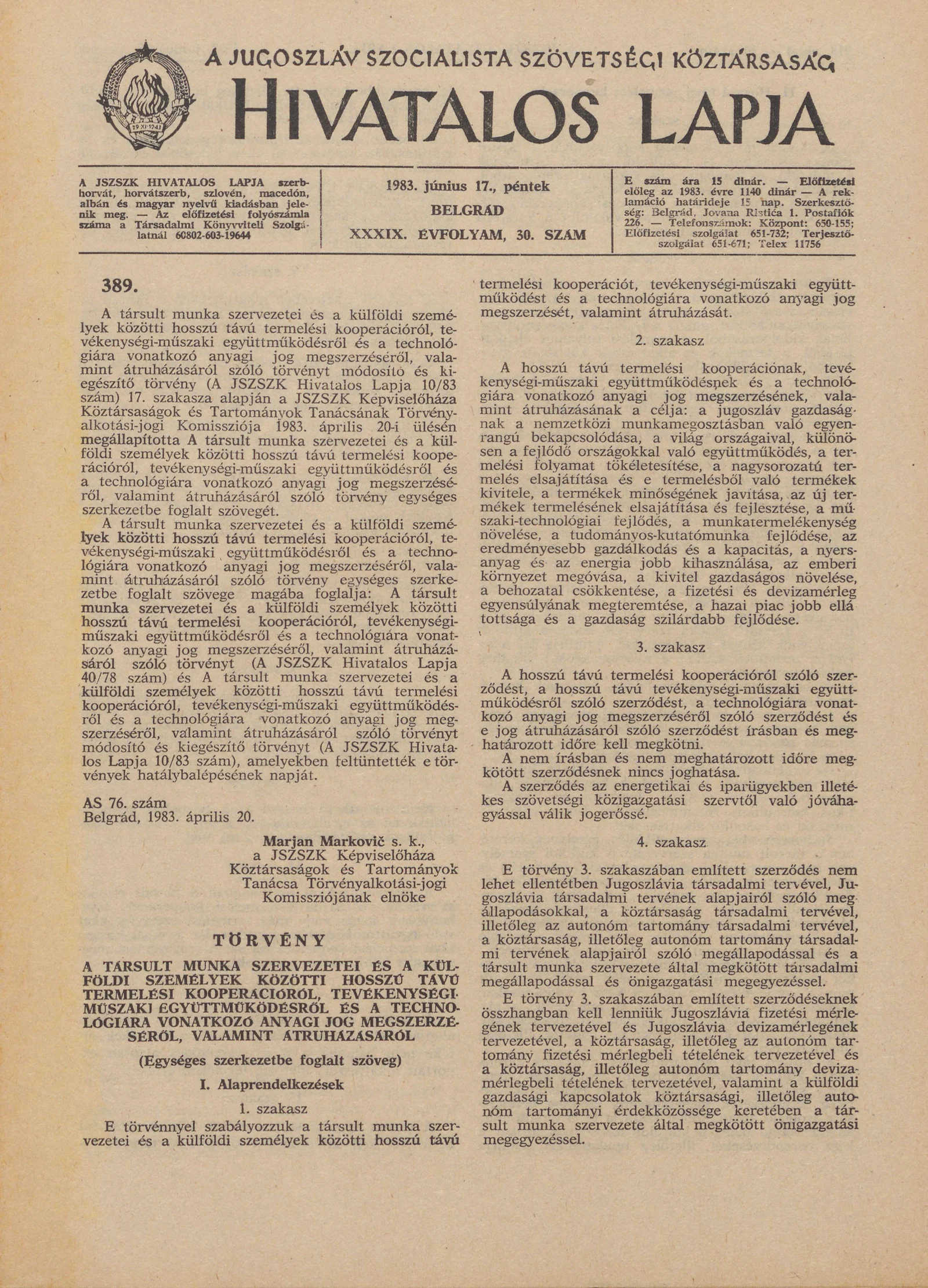 - Törvény a társult munka szervezetei és a külföldi személyek közötti hosszú távú termelési kooperációról, tevékenységi-műszaki együttműködésről és a technológiára vonatkozó anyagi jog megszerzéséről, valamint átruházásáról (Egységes szerkezetbe foglal...917