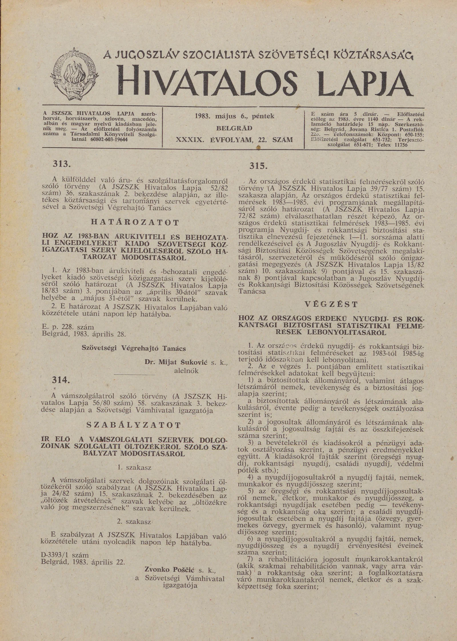 A Jugoszláv Szocialista Szövetségi Köztársaság Hivatalos Lapja, 39. évf. 1983. május 6. 22. sz. 493–500. oldal