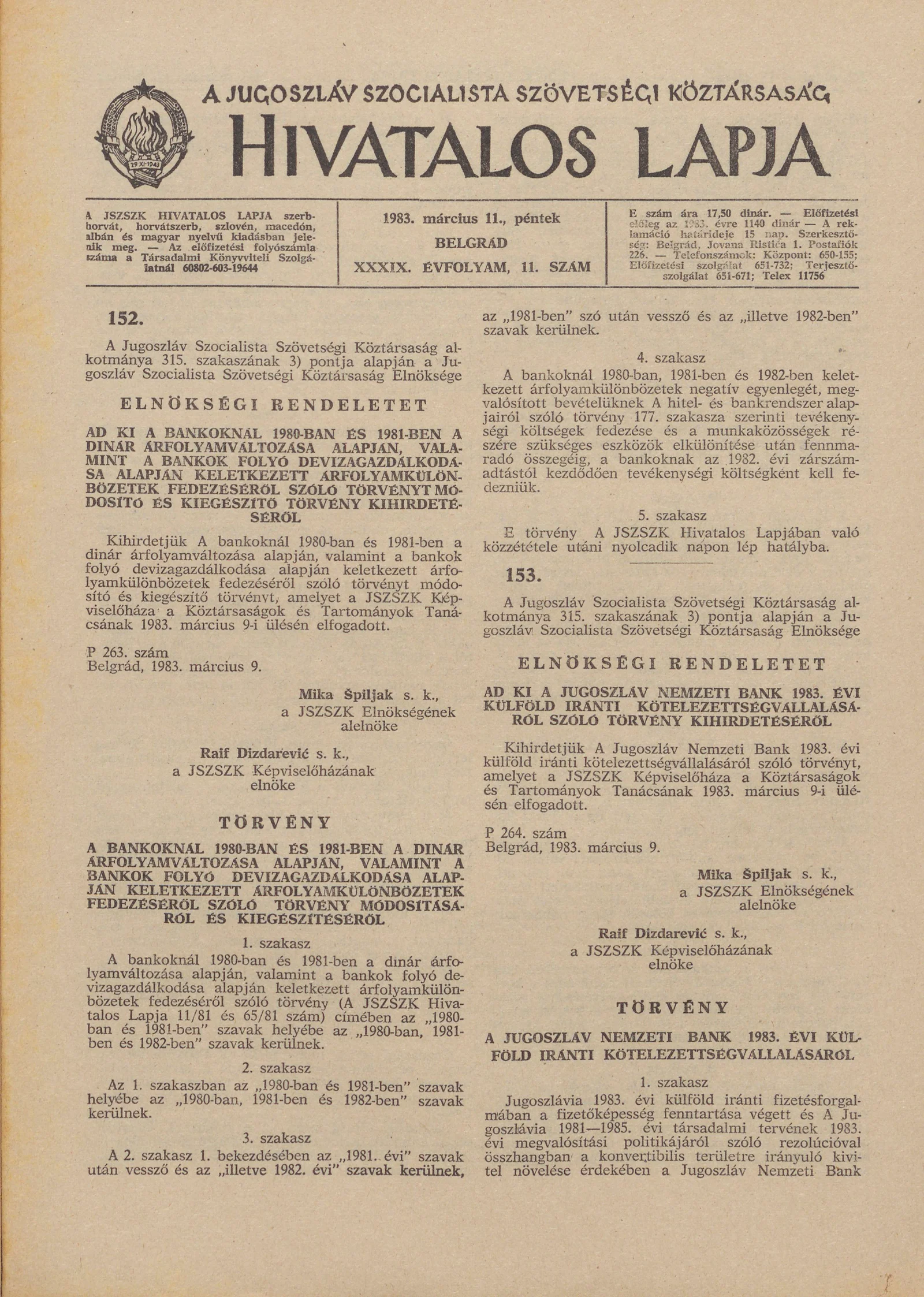 - Törvény A bankoknál 1980-ban és 1981-ben a dinár árfolyamváltozása alapán, valamint a bankok folyó devizagazdálkodása alapján keletkezett árfolyamkülönbözetek fedezéséről szóló törvény módosításáról és kiegészítéséről221