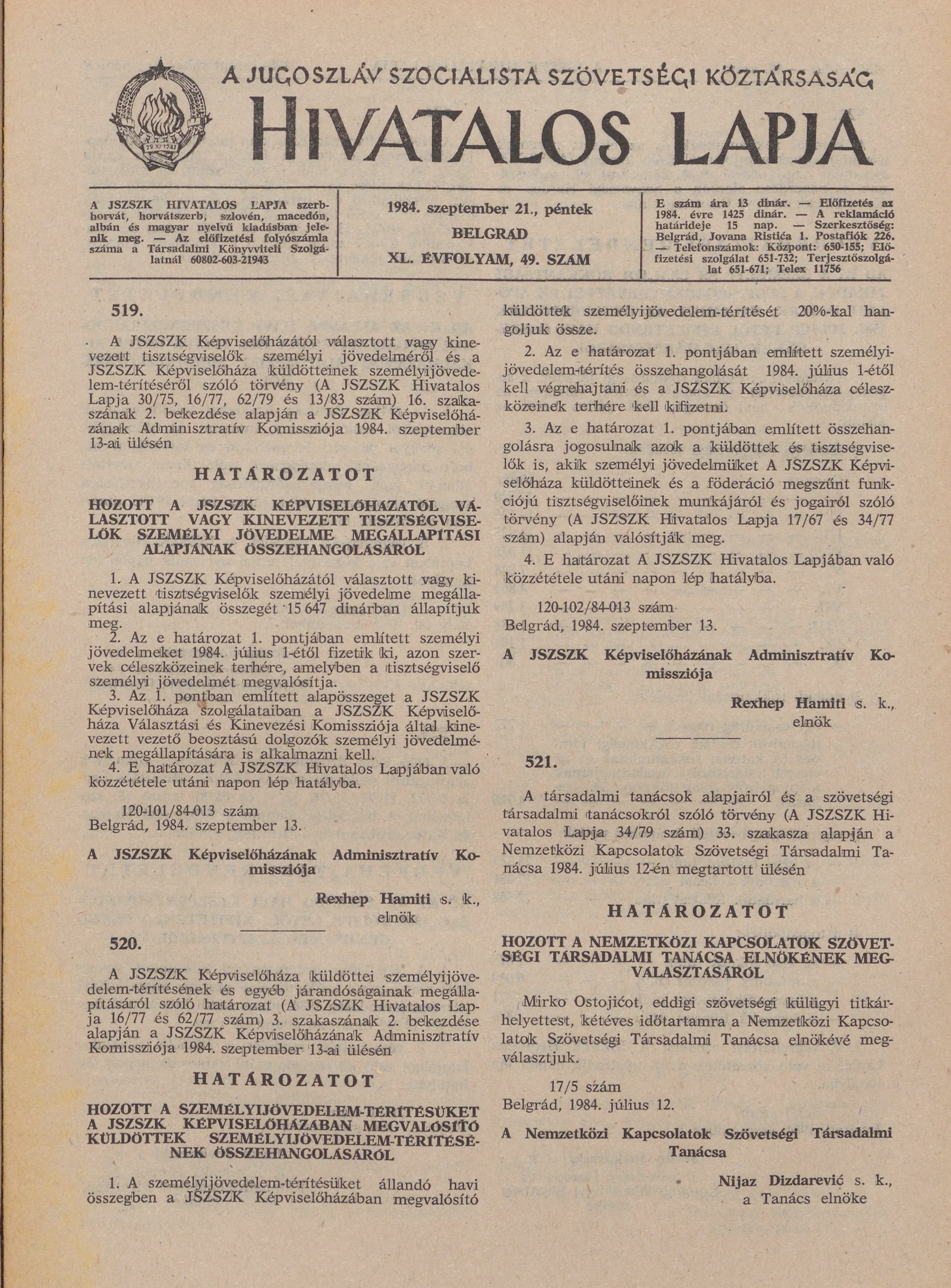 A Jugoszláv Szocialista Szövetségi Köztársaság Hivatalos Lapja, 40. évf. 1984. szeptember 21. 49. sz. 1155–1170. oldal