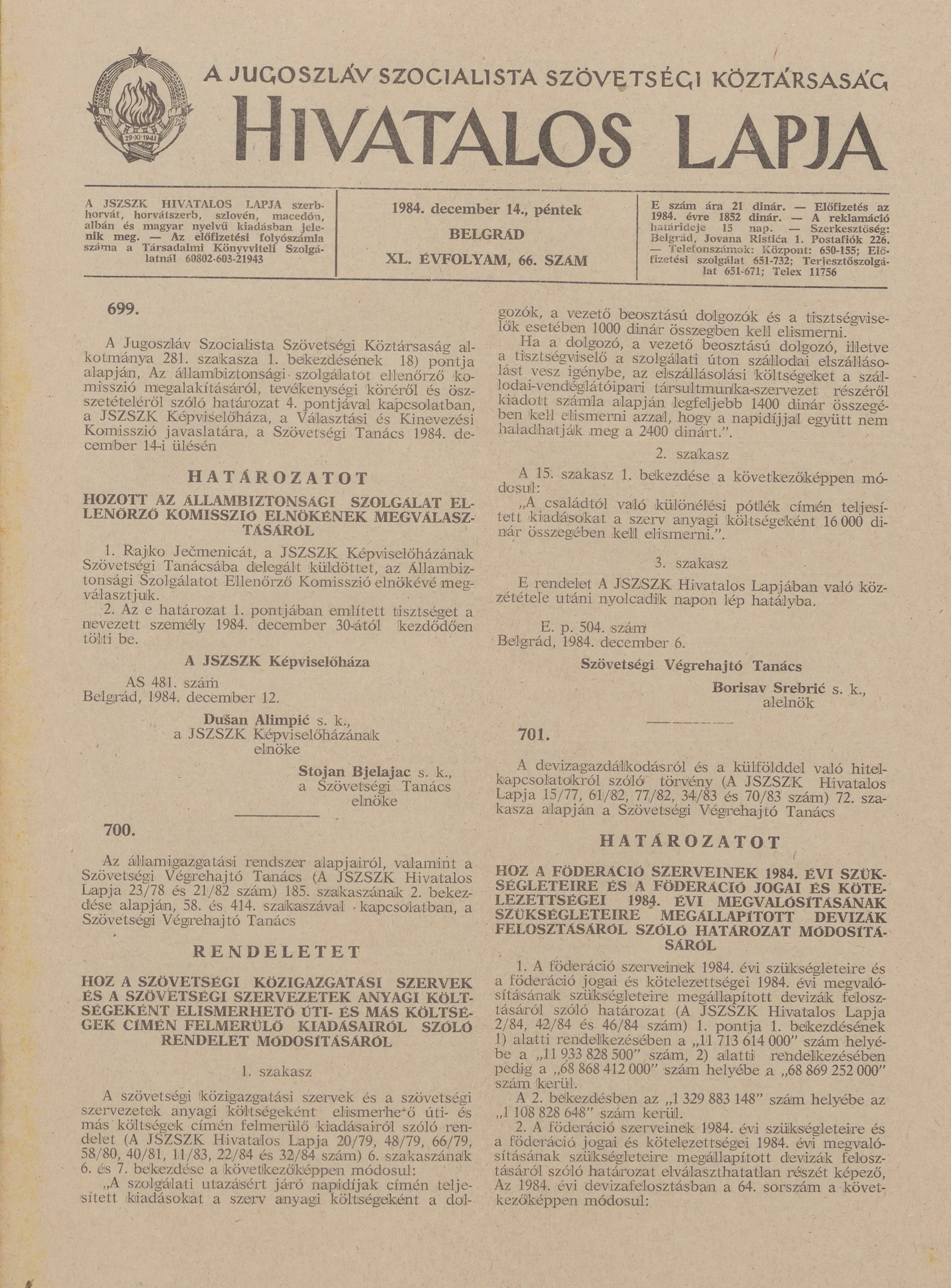 A Jugoszláv Szocialista Szövetségi Köztársaság Hivatalos Lapja, 40. évf. 1984. december 14. 66. sz. 1433–1452. oldal