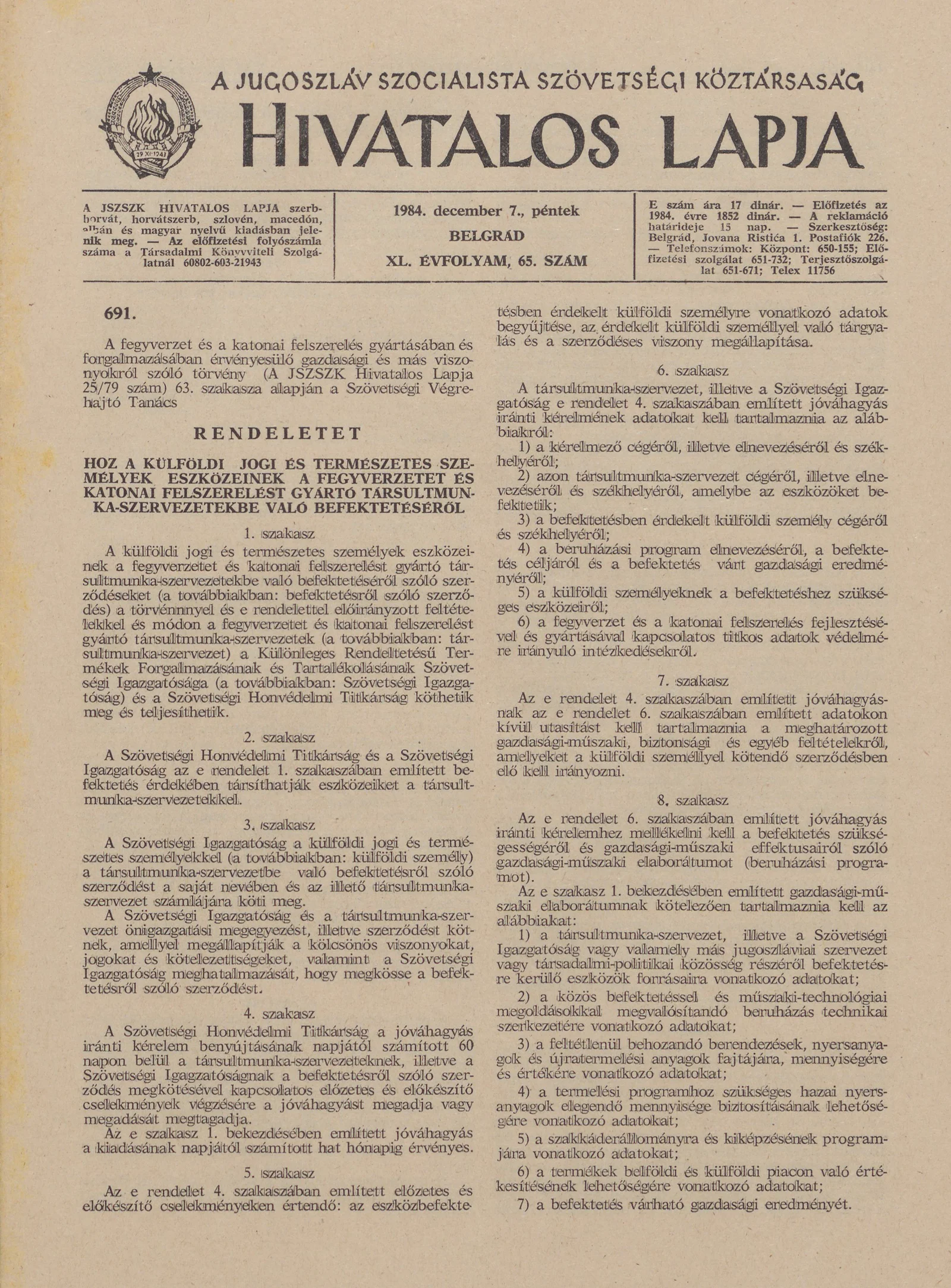 A Jugoszláv Szocialista Szövetségi Köztársaság Hivatalos Lapja, 40. évf. 1984. december 7. 65. sz. 1417–1432. oldal