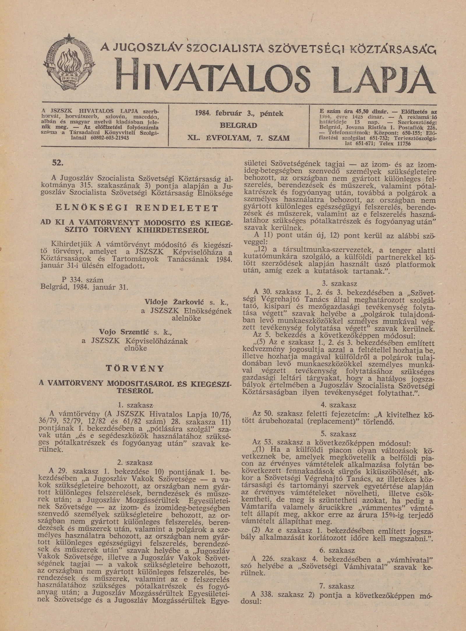 A Jugoszláv Szocialista Szövetségi Köztársaság Hivatalos Lapja, 40. évf. 1984. február 3. 7. sz. 267–322. oldal