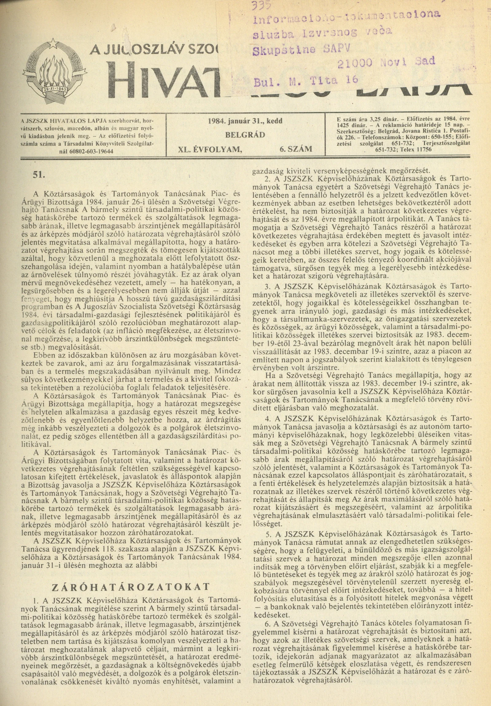 - A Jugoszláv Szocialista Szövetségi Köztársaság Hivatalos Lapja