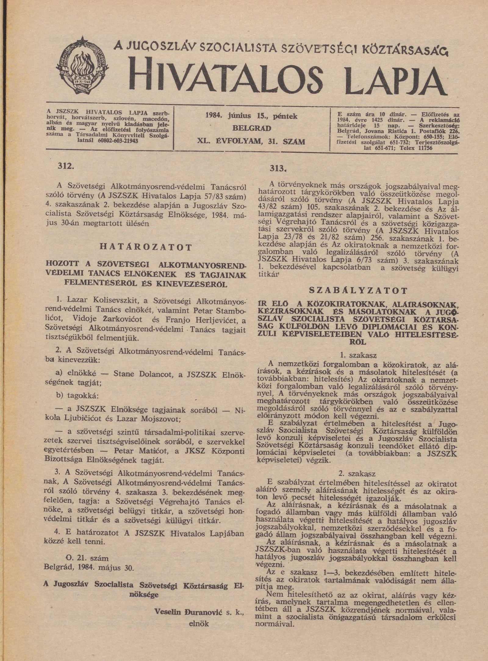 - A Jugoszláv Szocialista Szövetségi Köztársaság Hivatalos Lapja