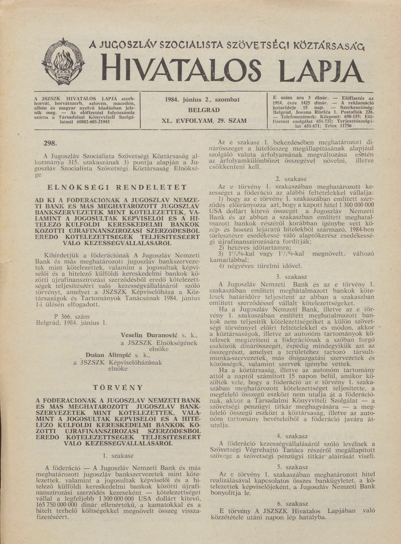 - A Jugoszláv Szocialista Szövetségi Köztársaság Hivatalos Lapja