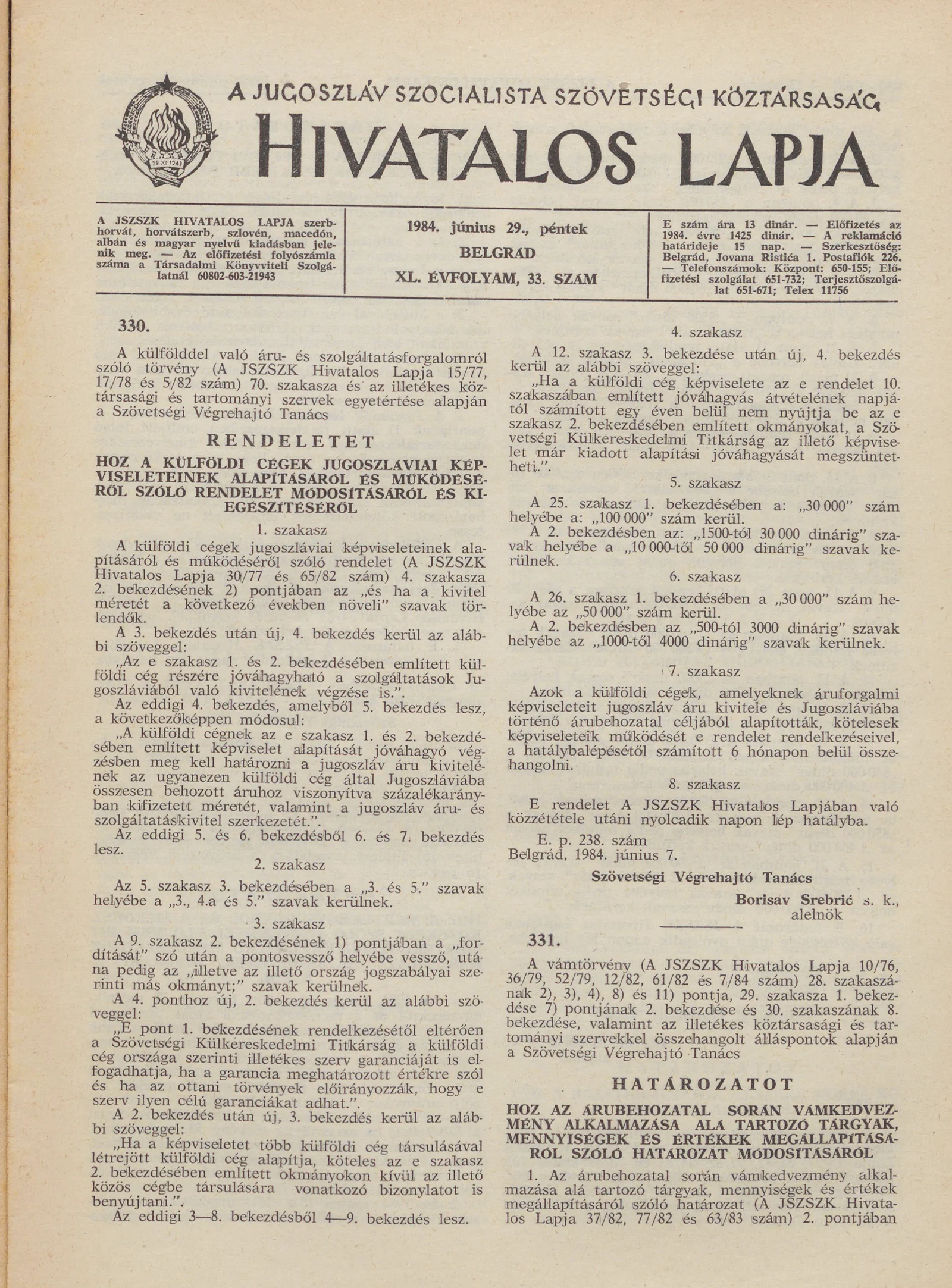 - Rendelet A külföldi cégek jugoszláviai képviseleteinek alapításáról és működéséről szóló rendelet módosításáról és kiegészítéséről879