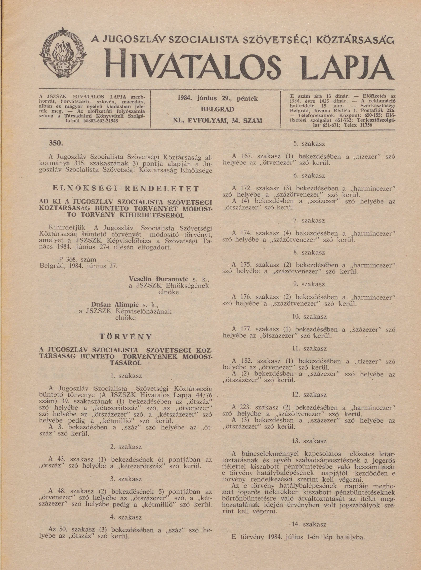 - Törvény A Jugoszláv Szocialista Szövetségi Köztársaság büntető törvényének módosításáról895