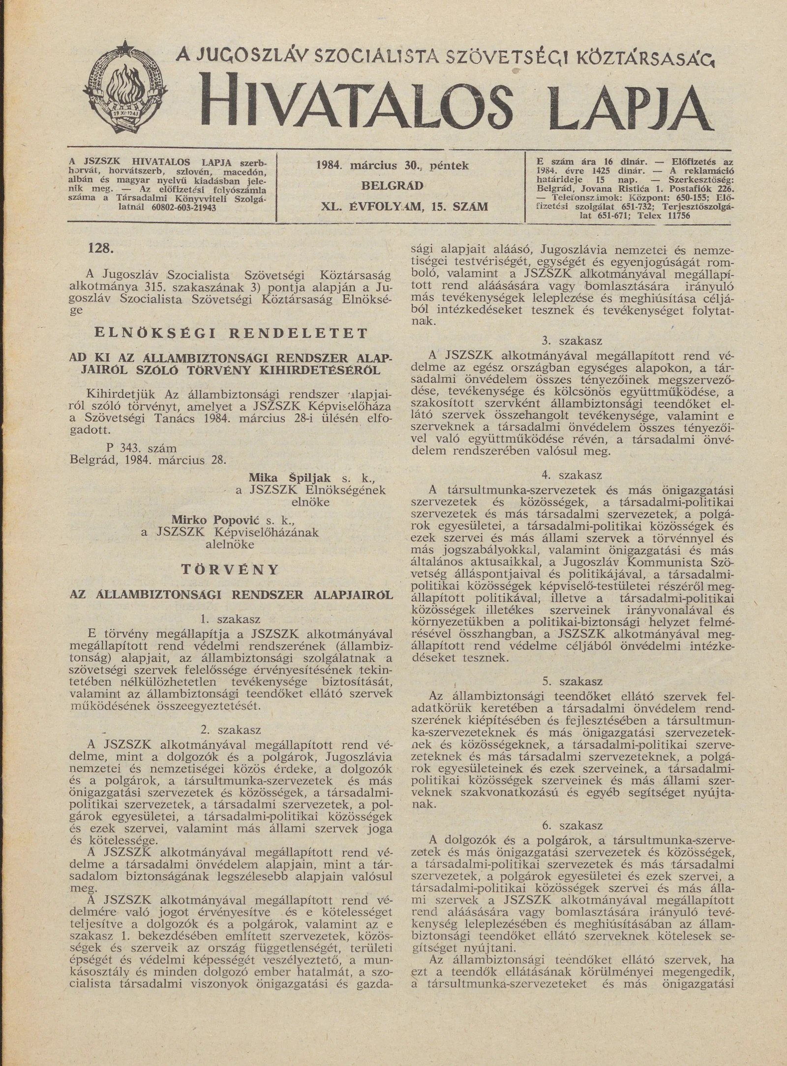 A Jugoszláv Szocialista Szövetségi Köztársaság Hivatalos Lapja, 40. évf. 1984. március 30. 15. sz. 447–466. oldal