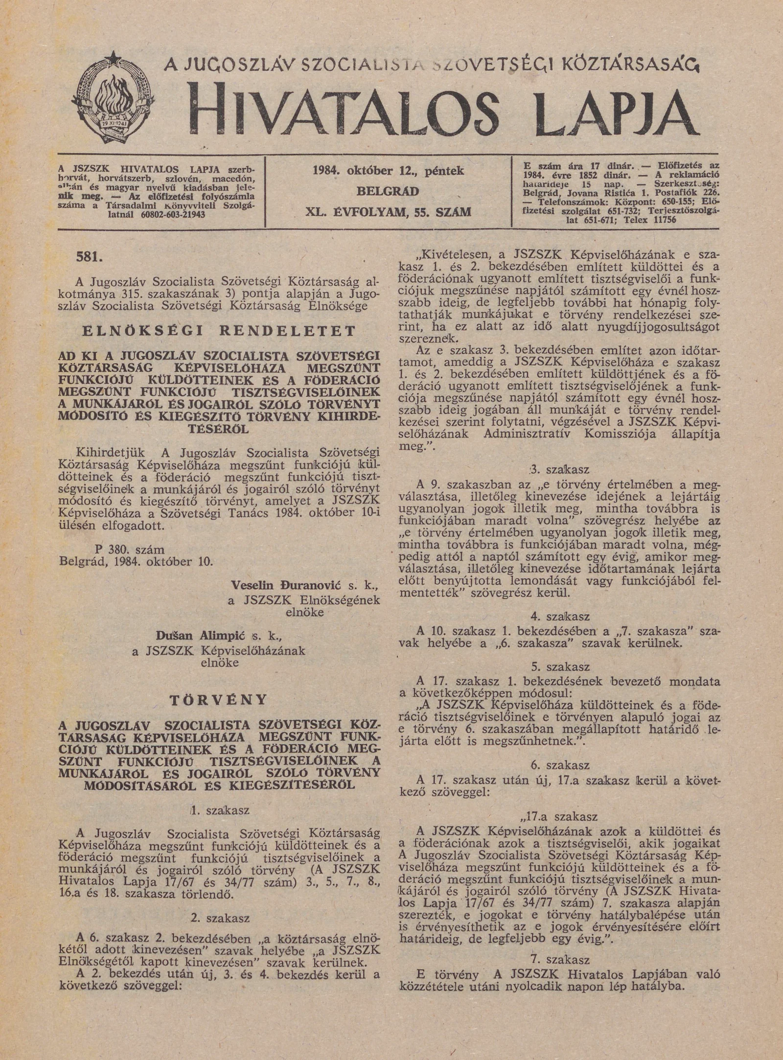 A Jugoszláv Szocialista Szövetségi Köztársaság Hivatalos Lapja, 40. évf. 1984. október 12. 55. sz. 1243–1258. oldal