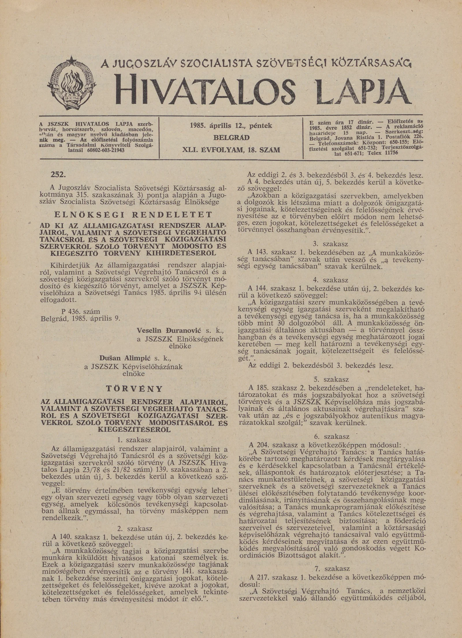 A Jugoszláv Szocialista Szövetségi Köztársaság Hivatalos Lapja, 41. évf. 1985. április 12. 18. sz. 673–688. oldal