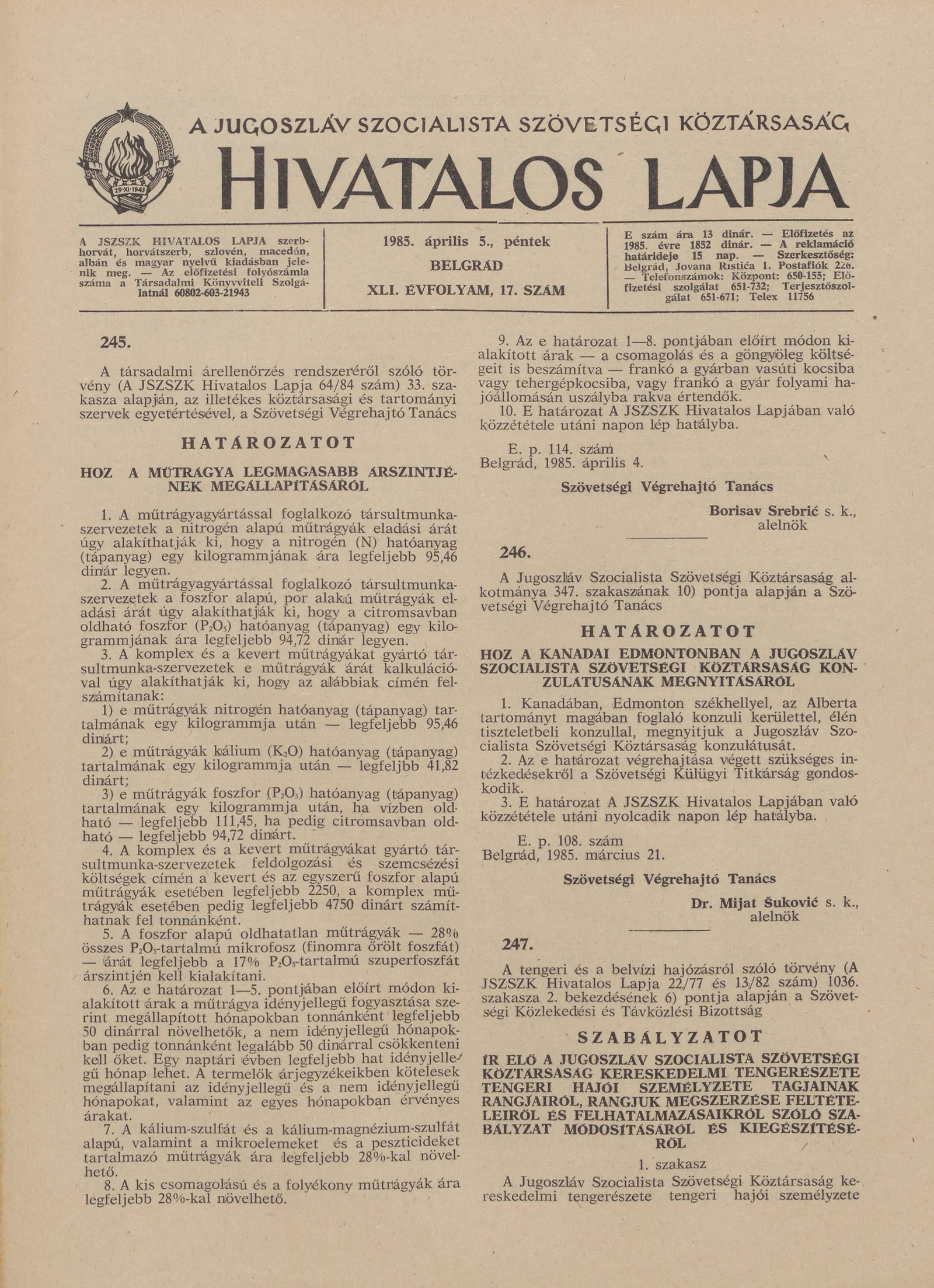 A Jugoszláv Szocialista Szövetségi Köztársaság Hivatalos Lapja, 41. évf. 1985. április 5. 17. sz. 661–672. oldal