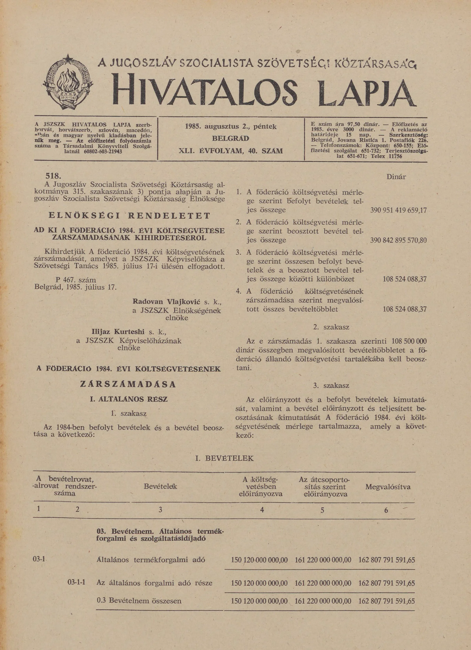 A Jugoszláv Szocialista Szövetségi Köztársaság Hivatalos Lapja, 41. évf. 1985. augusztus 2. 40. sz. 1193–1244. oldal
