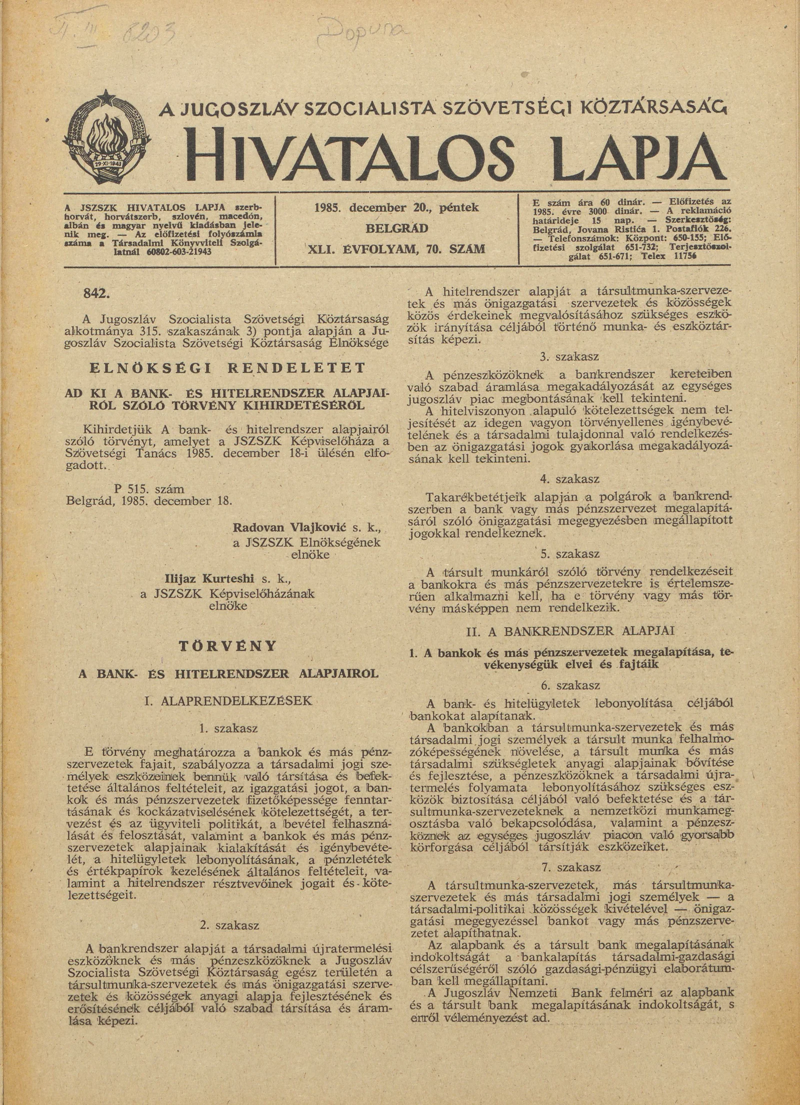 A Jugoszláv Szocialista Szövetségi Köztársaság Hivatalos Lapja, 41. évf. 1985. december 20. 70. sz. 1937–1968. oldal