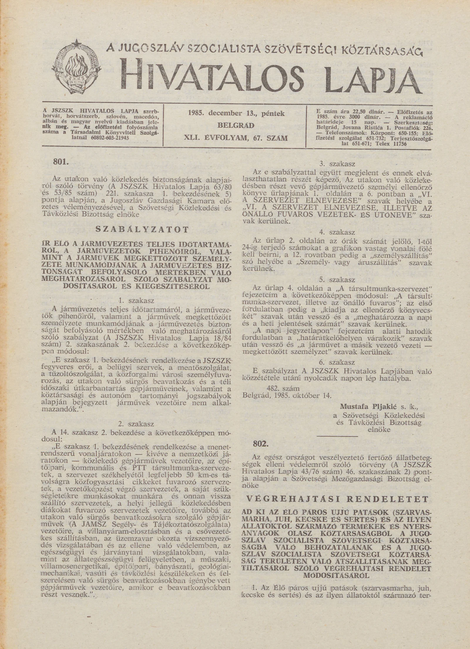 A Jugoszláv Szocialista Szövetségi Köztársaság Hivatalos Lapja, 41. évf. 1985. december 13. 67. sz. 1709–1720. oldal