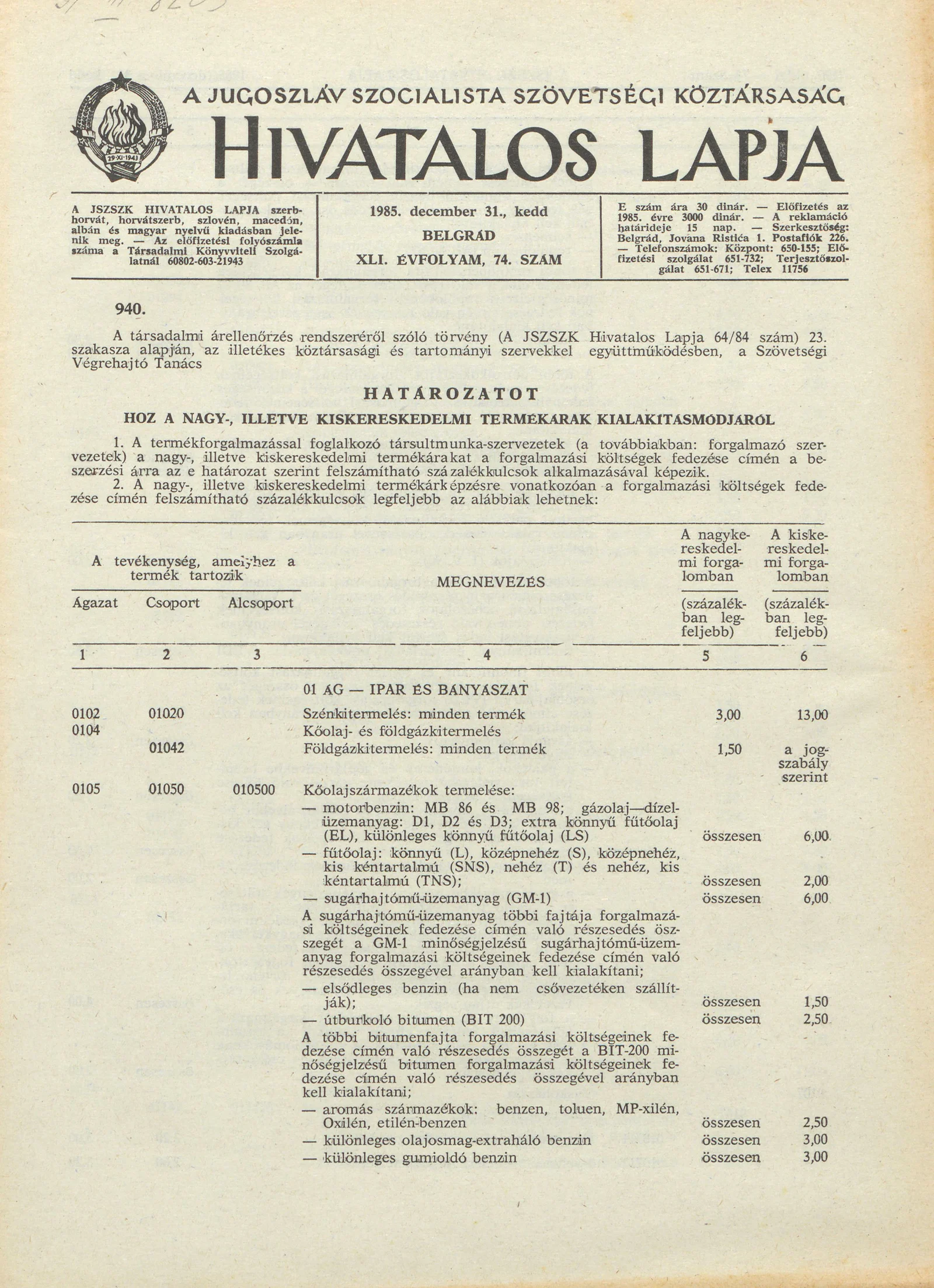 A Jugoszláv Szocialista Szövetségi Köztársaság Hivatalos Lapja, 41. évf. 1985. december 31. 74. sz. 2189–2204. oldal