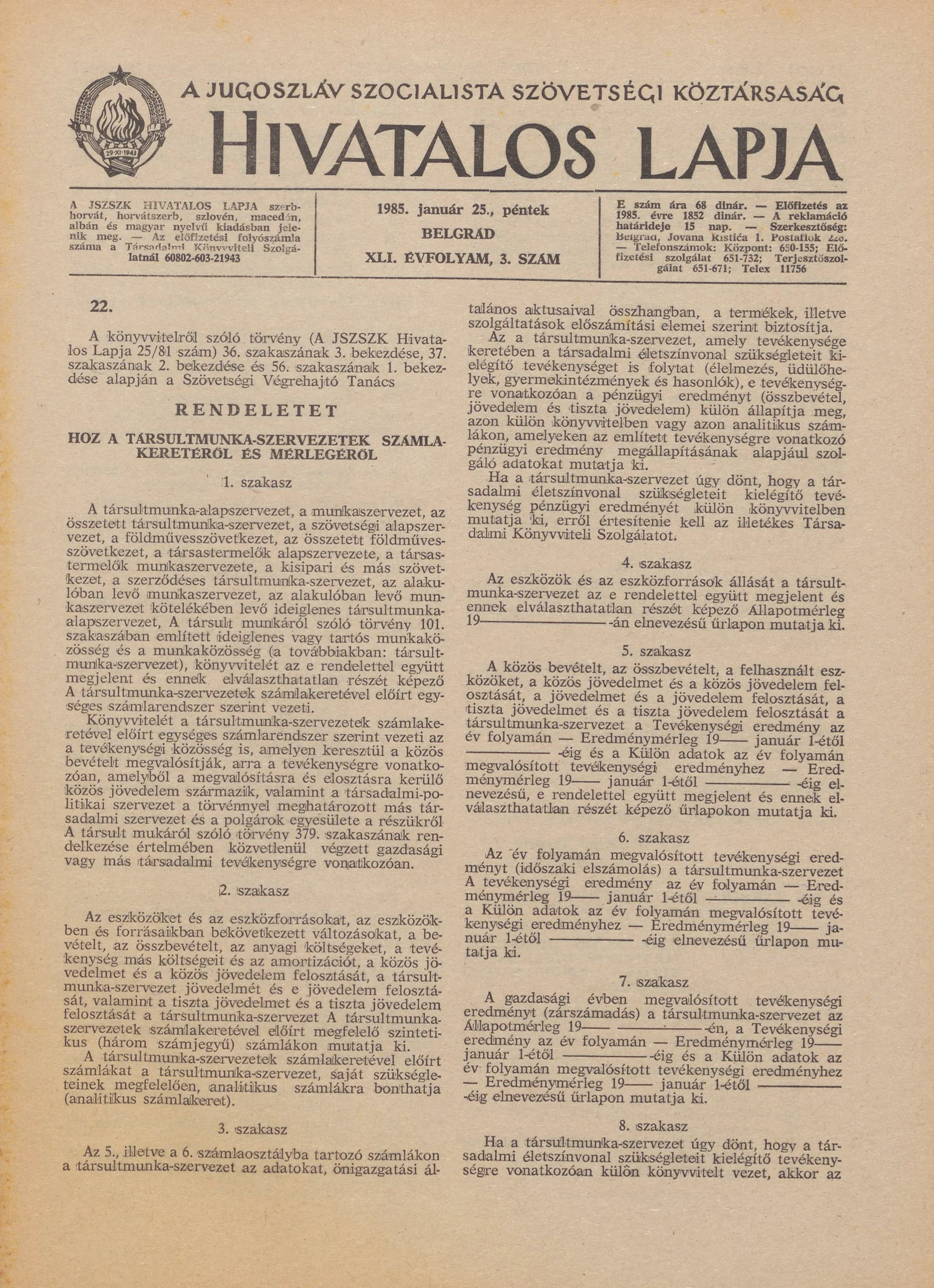 A Jugoszláv Szocialista Szövetségi Köztársaság Hivatalos Lapja, 41. évf. 1985. január 25. 3. sz. 49–112. oldal