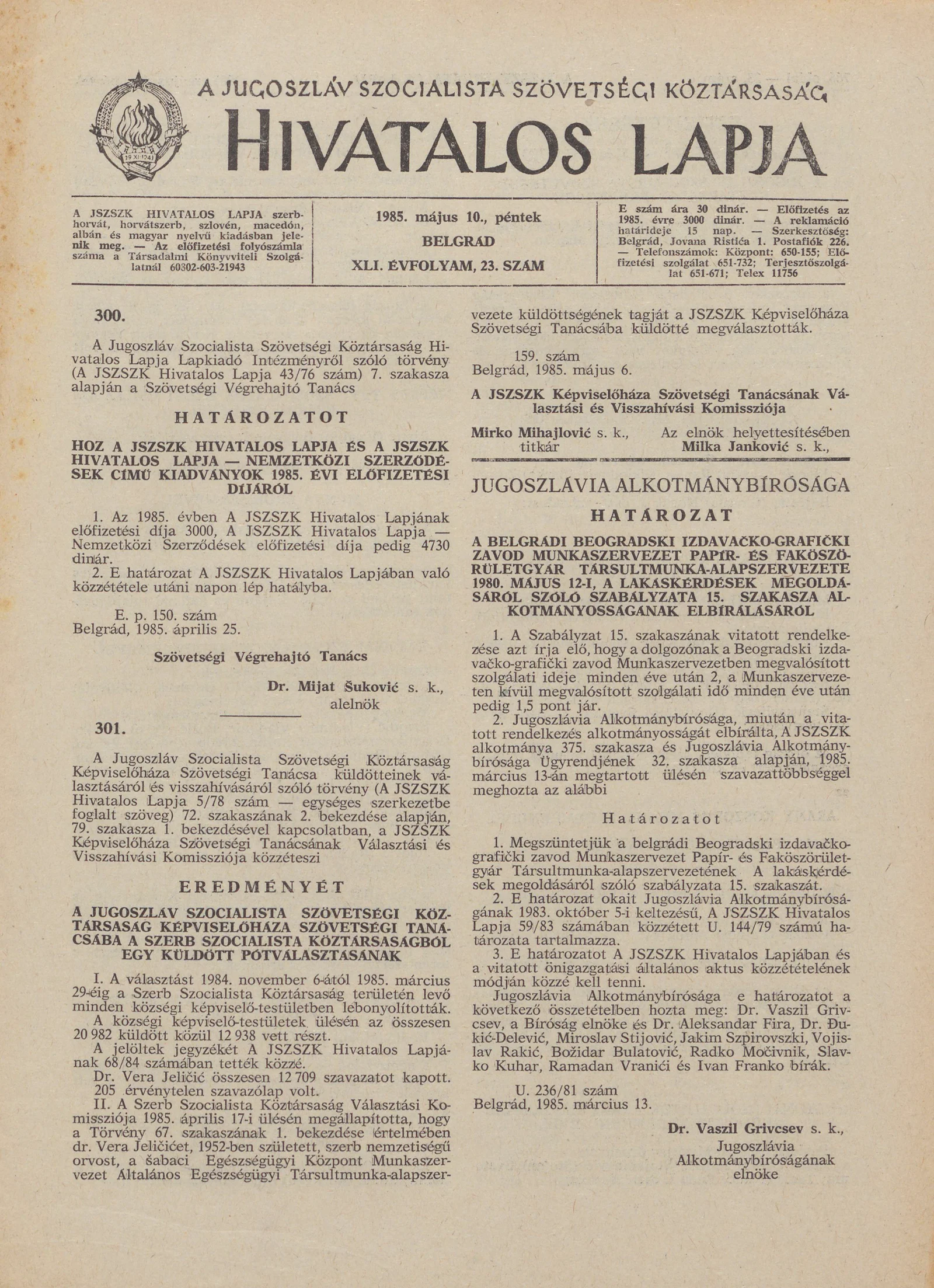 - Határozat A JSZSZK Hivatalos Lapja és A JSZSZK Hivatalos Lapja — Nemzetközi Szerződések című kiadványok 1985. évi előfizetési díjáról765